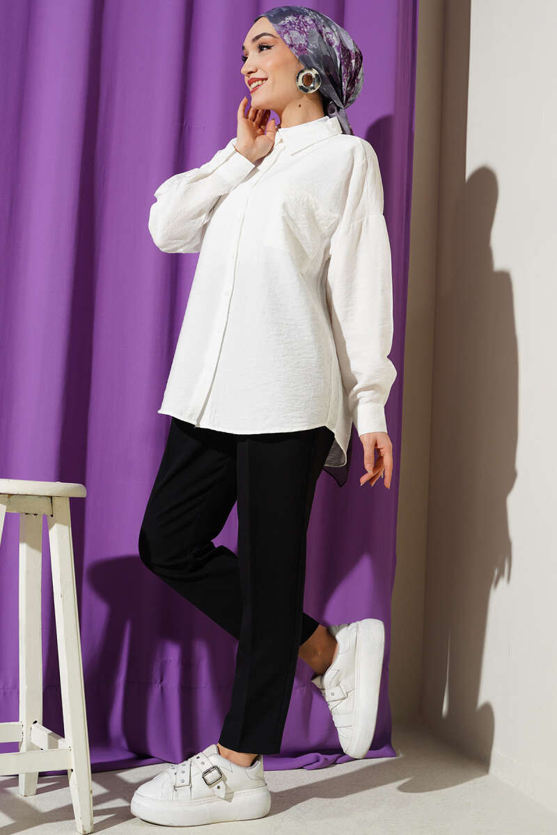 Düşük omuz kesimi ve geniş formuyla modern, eforsuz bir şıklık sunan rahat bir tasarımdır. Ön kısmındaki tek cep detayı modele fonksiyonel ve dinamik bir hava katarken, hafif dokulu kumaşı gün boyu konforlu bir kullanım sağlar. Klasik yaka yapısı ve dökümlü silüeti sayesinde hem jean pantolonlarla hem de kumaş alt gruplarıyla mükemmel bir uyum yakalar.