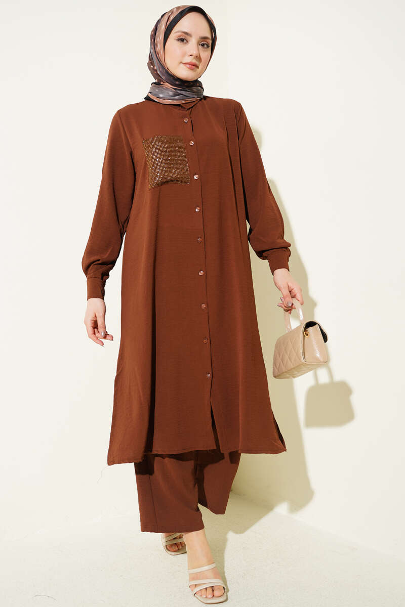 Pilise Detaylı Kruvaze İkili Takım Kahve