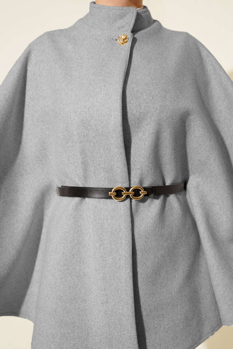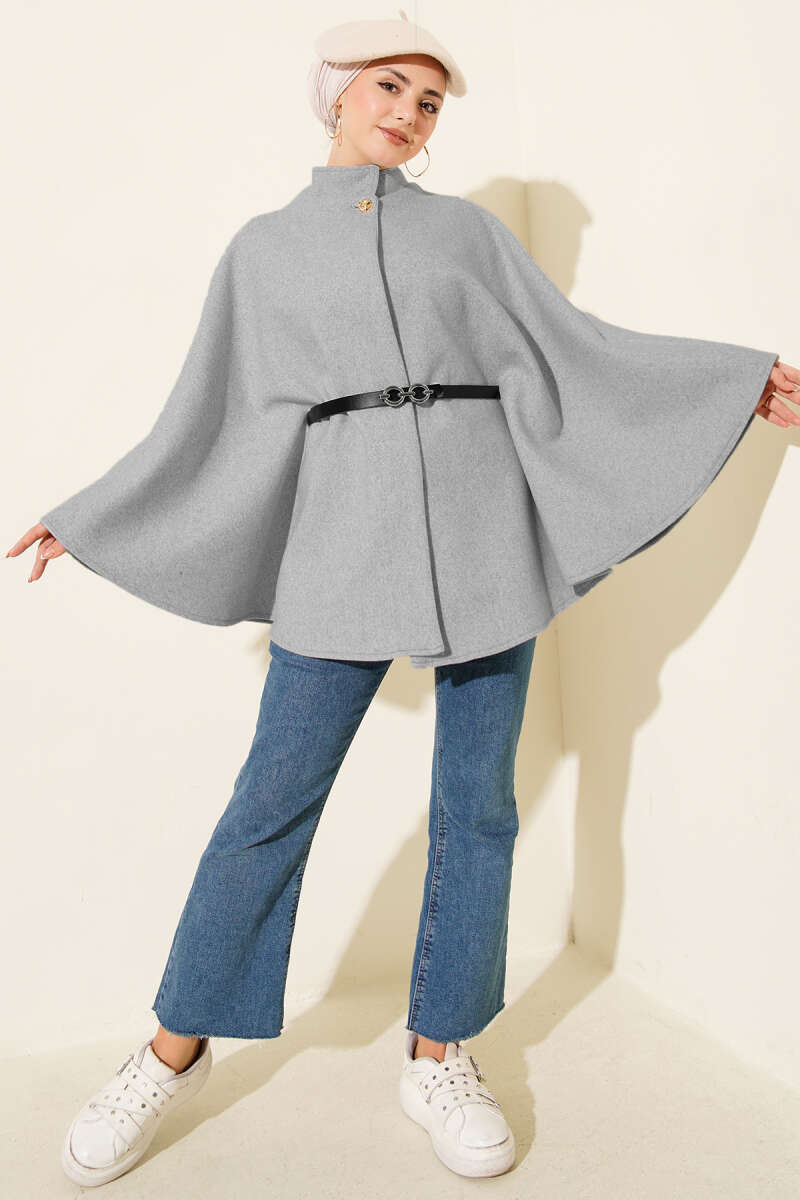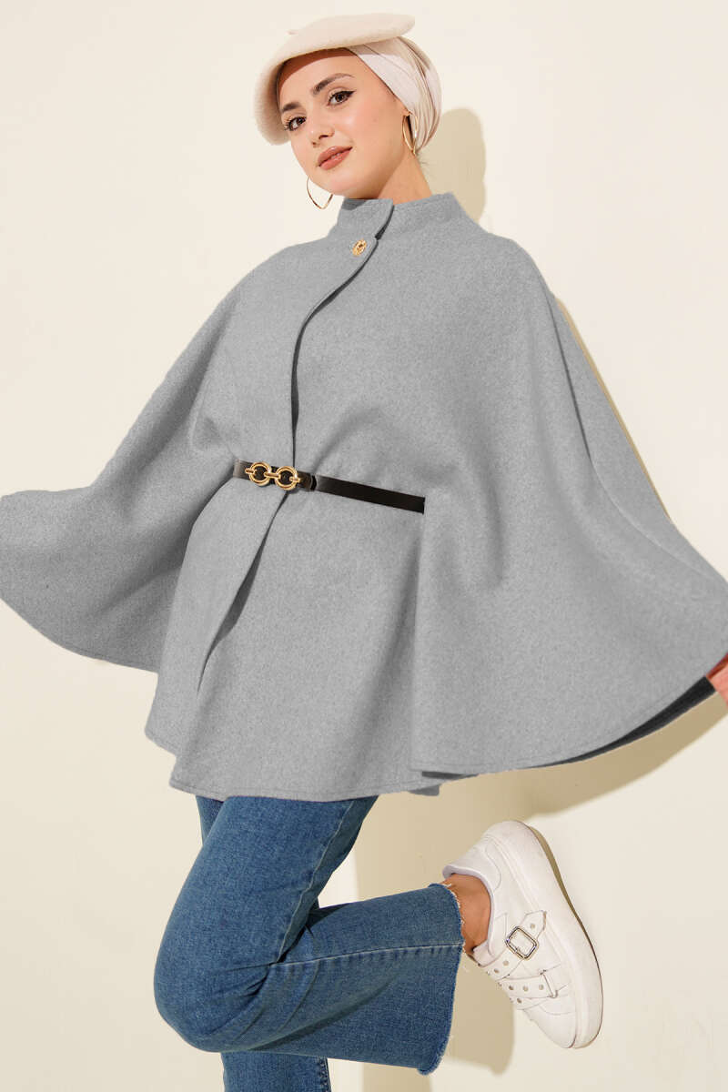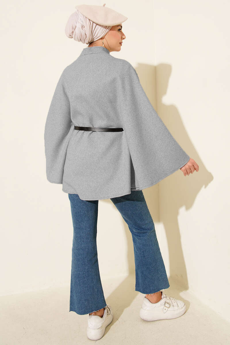 Gömlek Yaka Düğmeli Kaşe Panço Gri