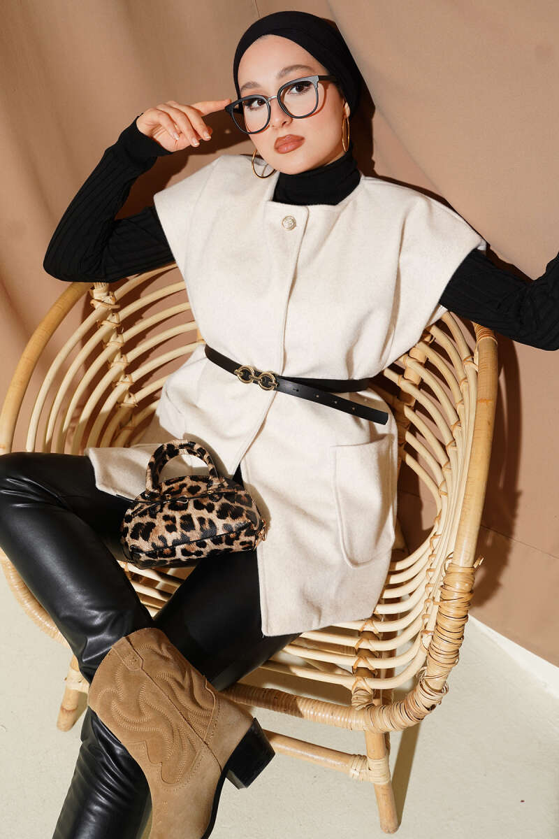 Tek Düğmeli Kemerli Sakallı Yelek Latte