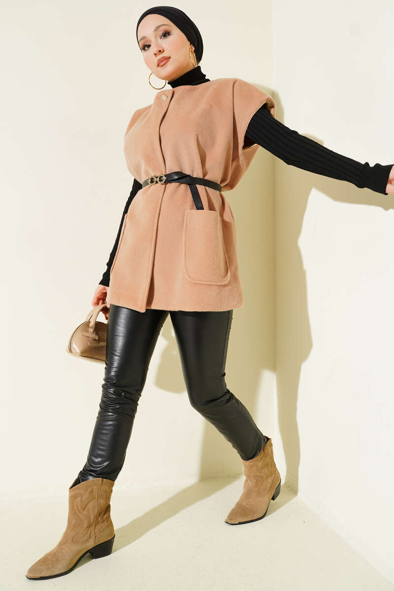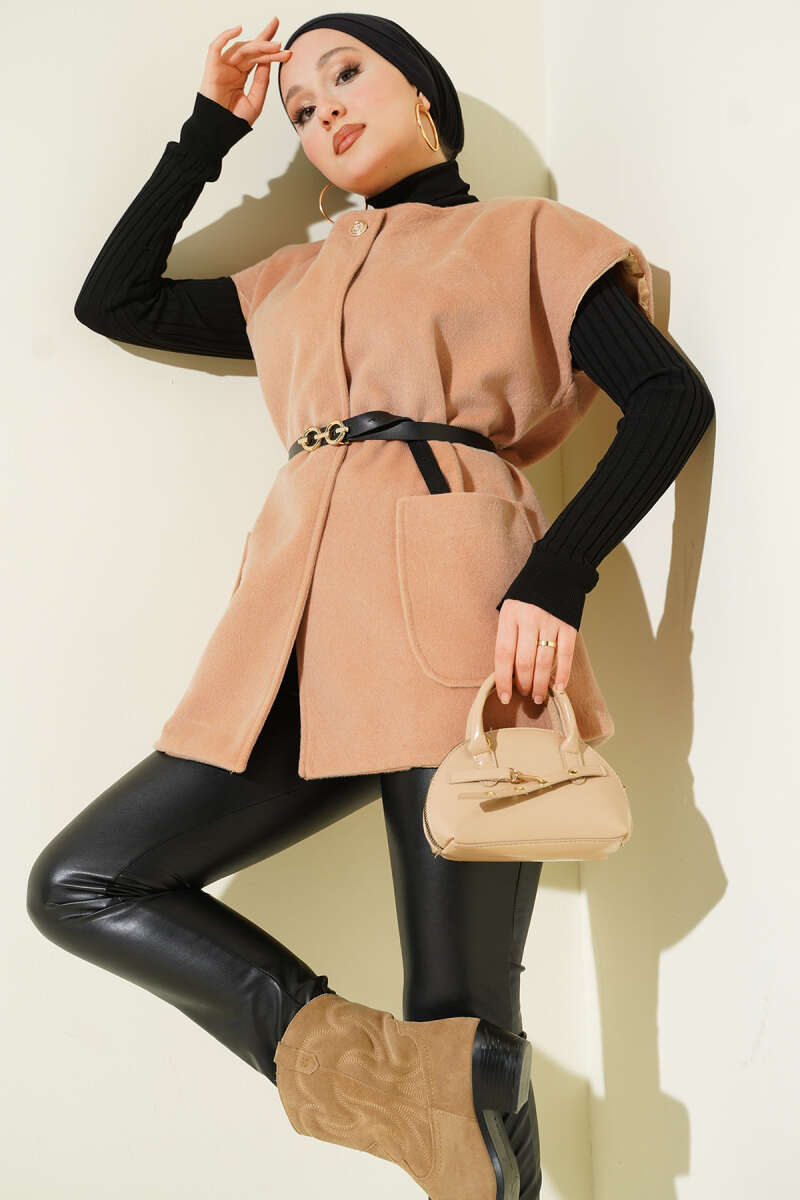 Tek Düğmeli Kemerli Sakallı Yelek Bej
