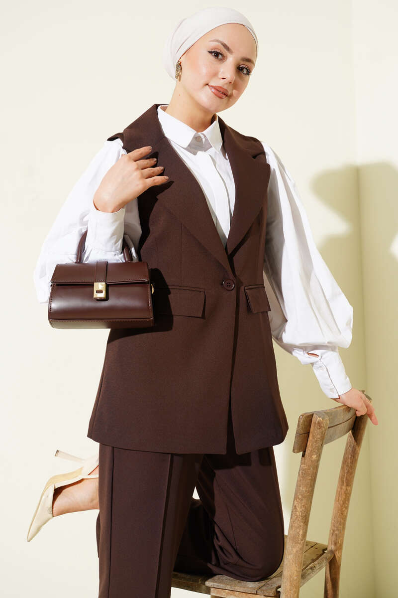Tek Düğmeli Kruvaze Yaka Yelekli Takım Bej