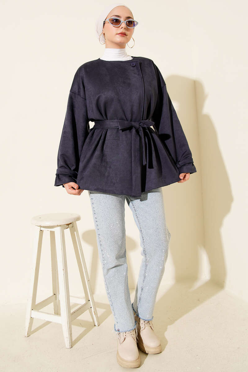 Tek Düğmeli Kuşaklı Süet Ceket Siyah