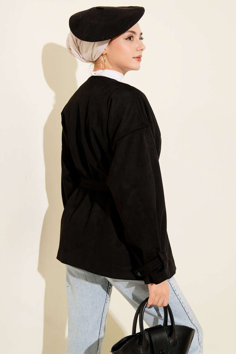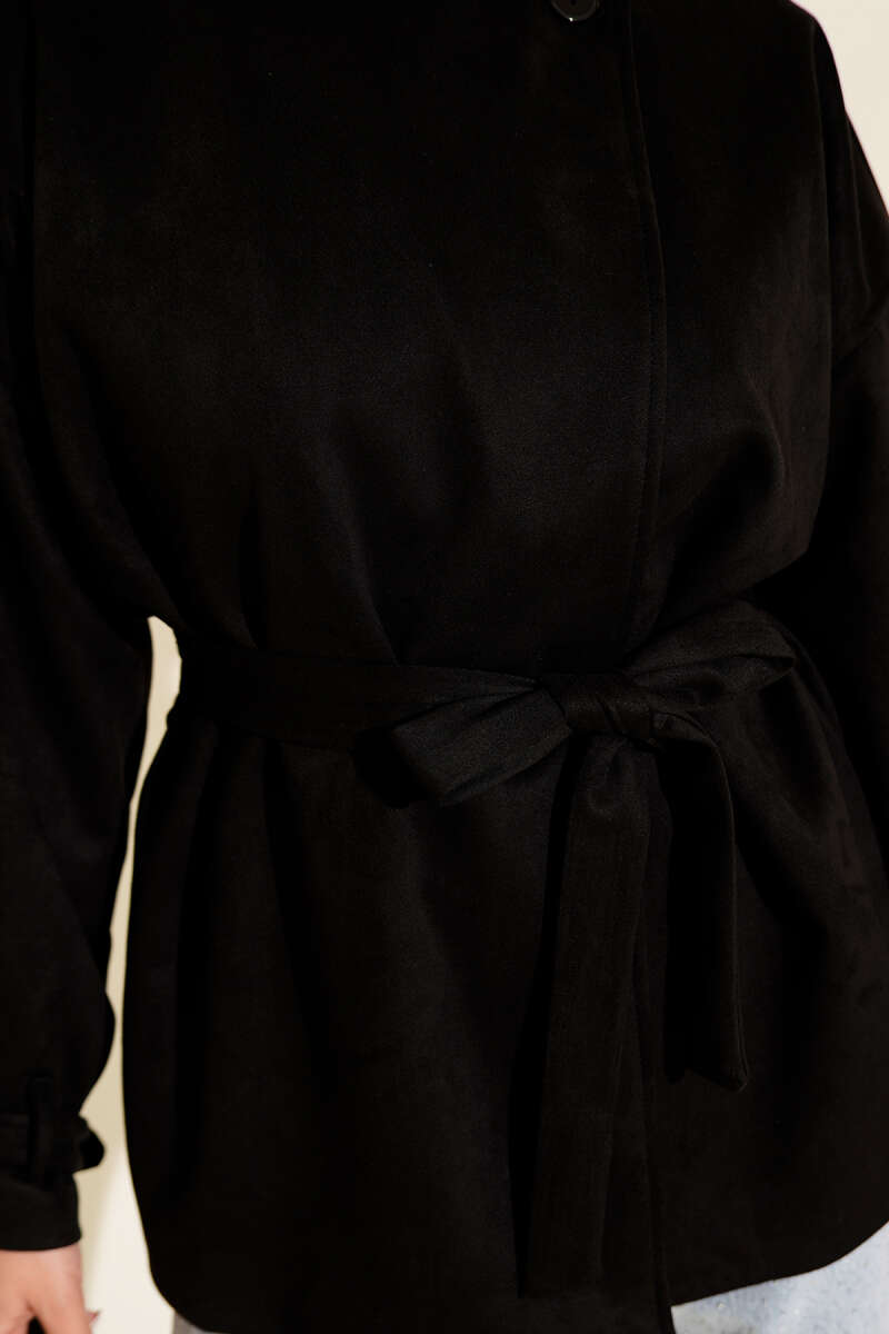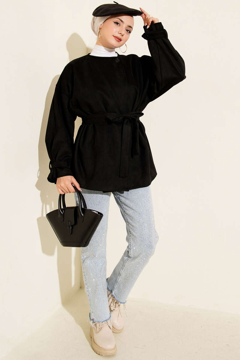 Önü Bağlamalı Keçe Kısa Ceket Siyah