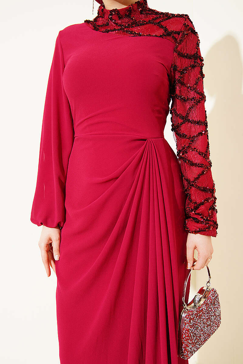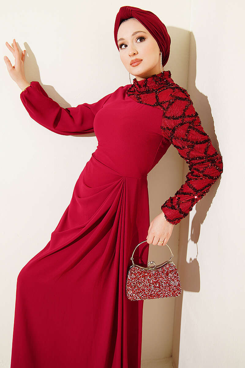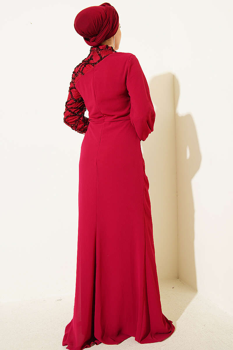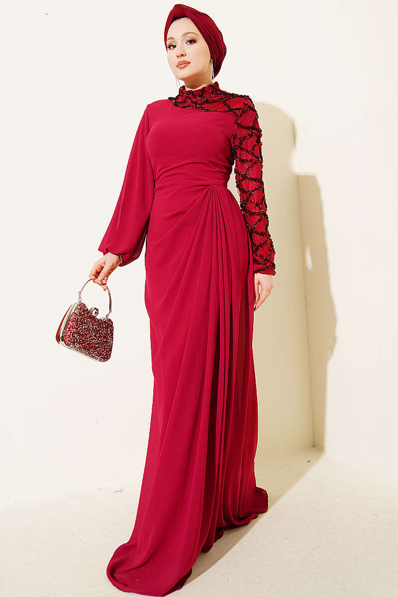 Tek Kol Pul Payet Detaylı Abiye Elbise Bordo