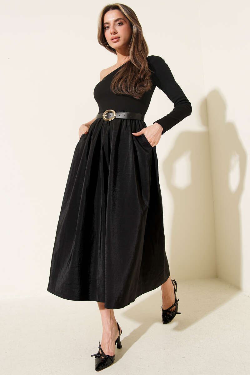 Tek Kollu Kemerli Paraşüt Midi Elbise Siyah