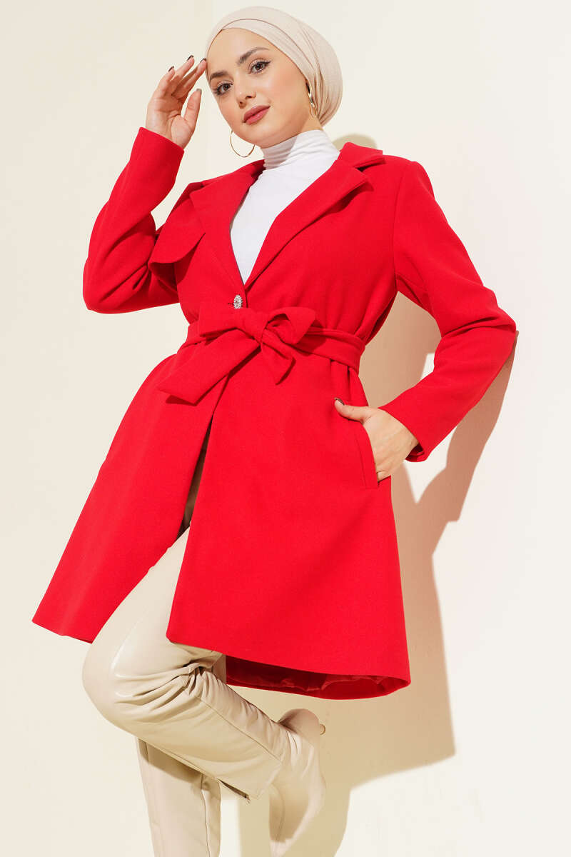 Kuşaklı Gold Düğmeli Kaşe Kaban Saks