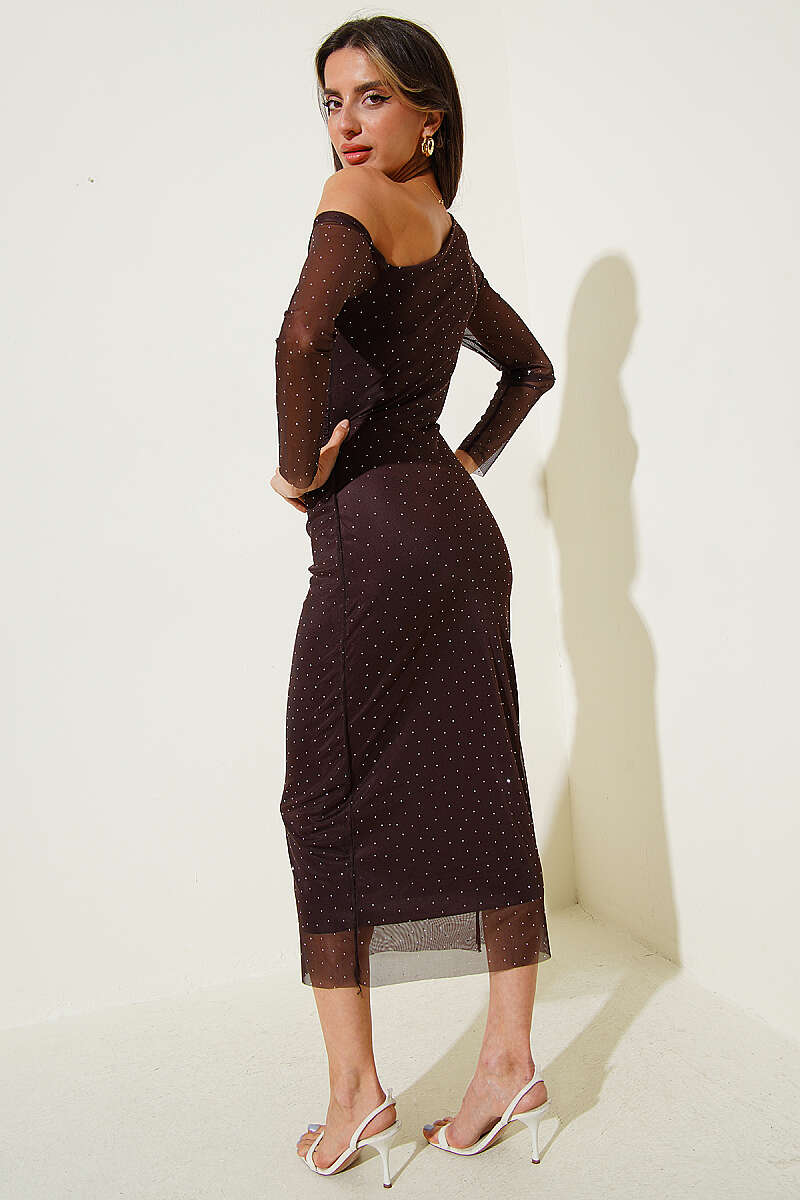 Tek Omuz Mini Taşlı Elbise Kahve