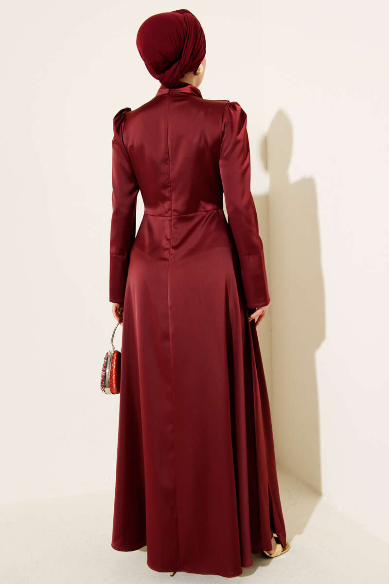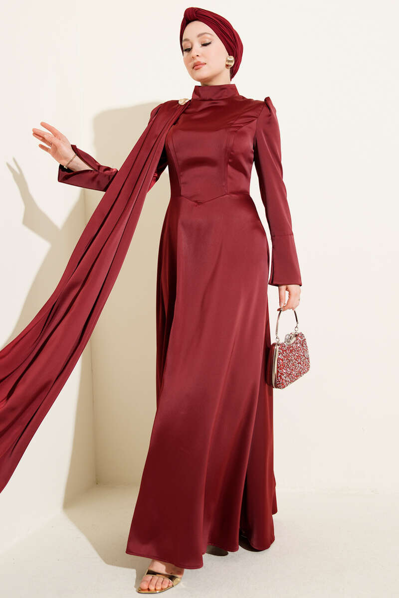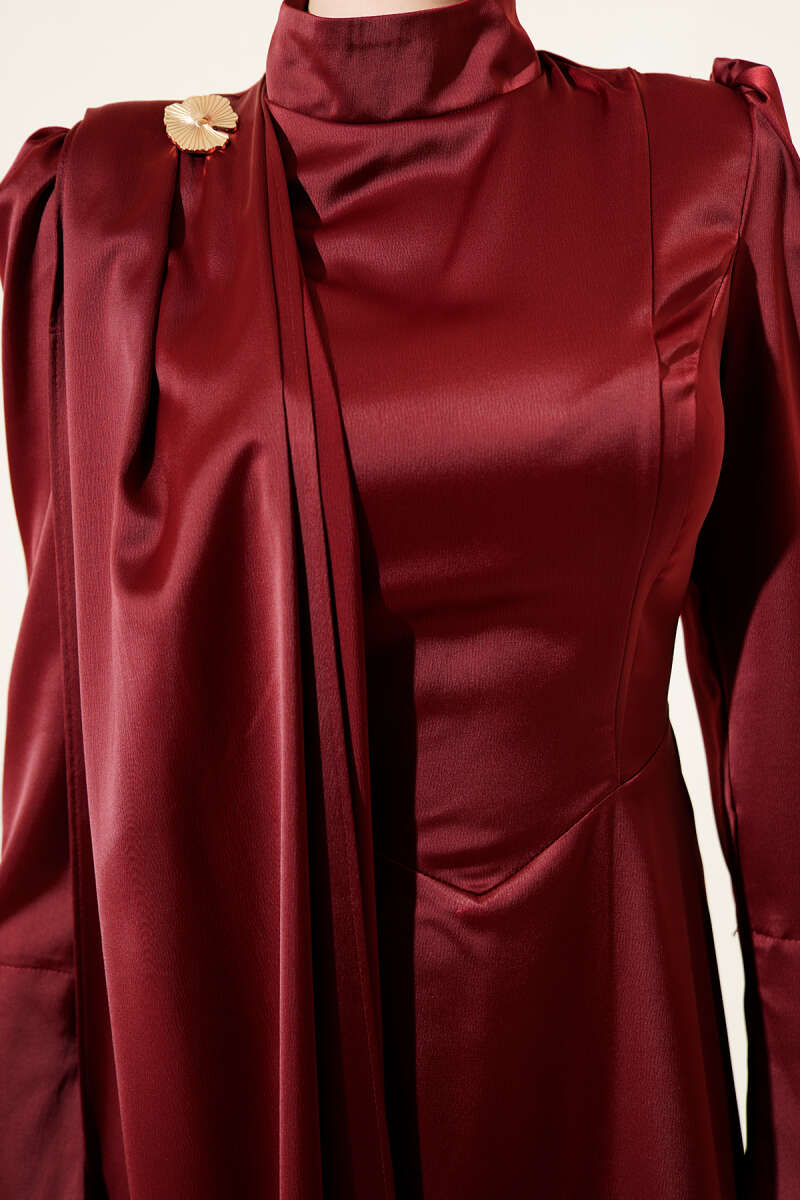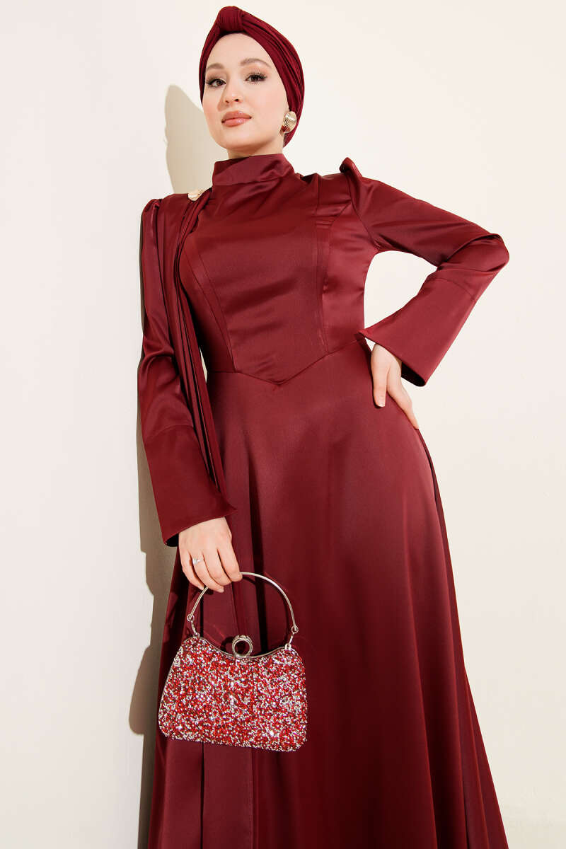 Fularlı Kemerli Saten Abiye Elbise Bordo
