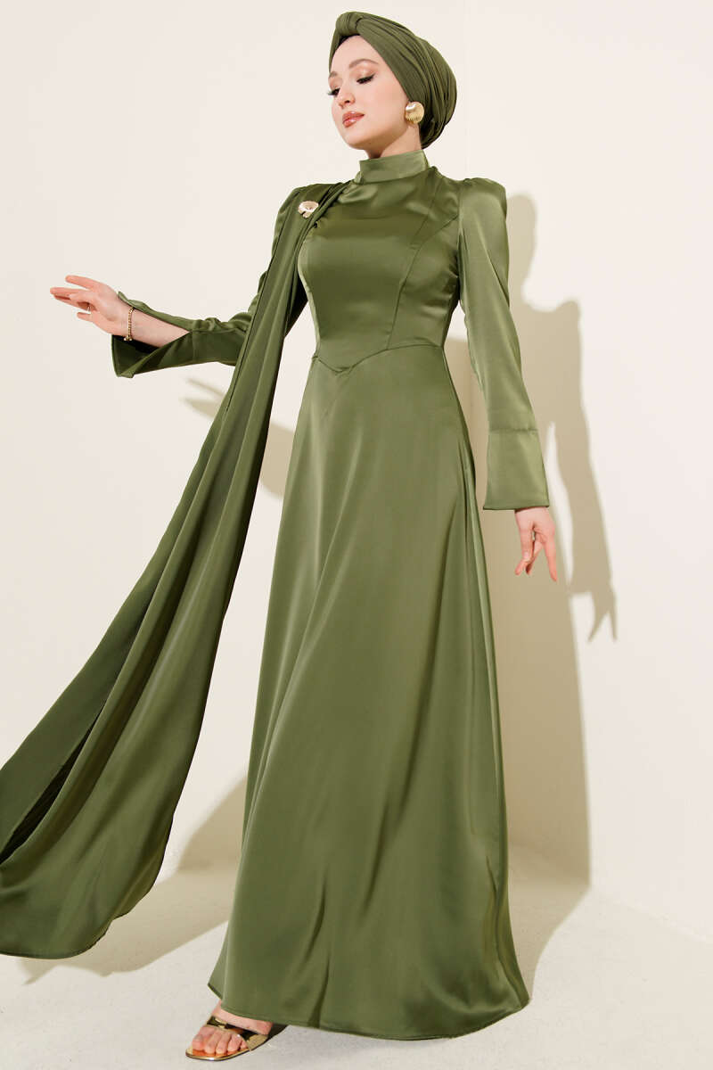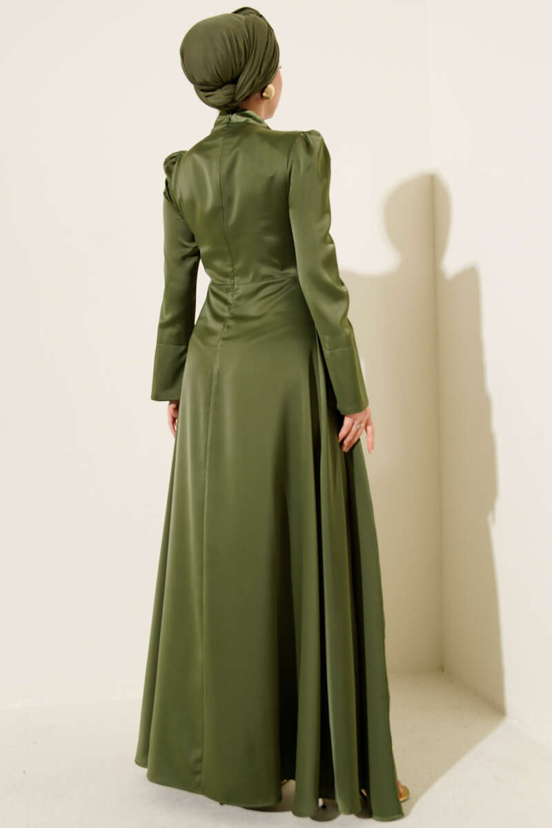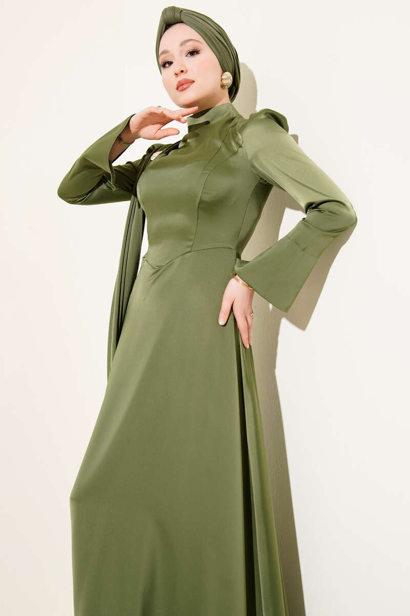 Fularlı Kemerli Saten Abiye Elbise Zümrüt