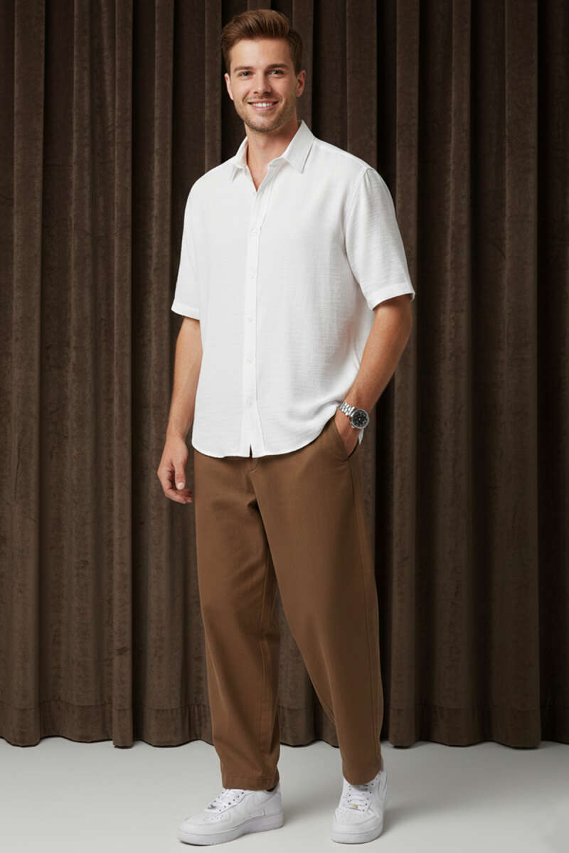Bilek Manşetli Keten Erkek Gömlek Beyaz