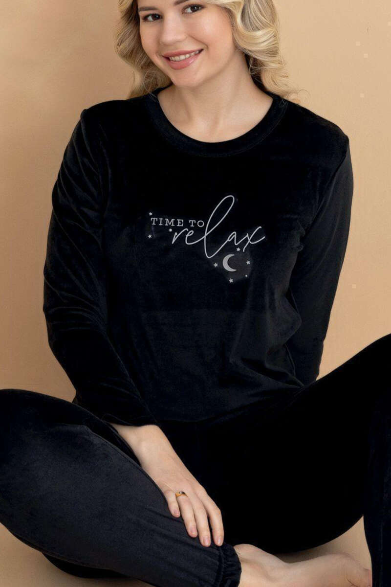 Time To Relax Baskılı Kadife Pijama Takımı Siyah