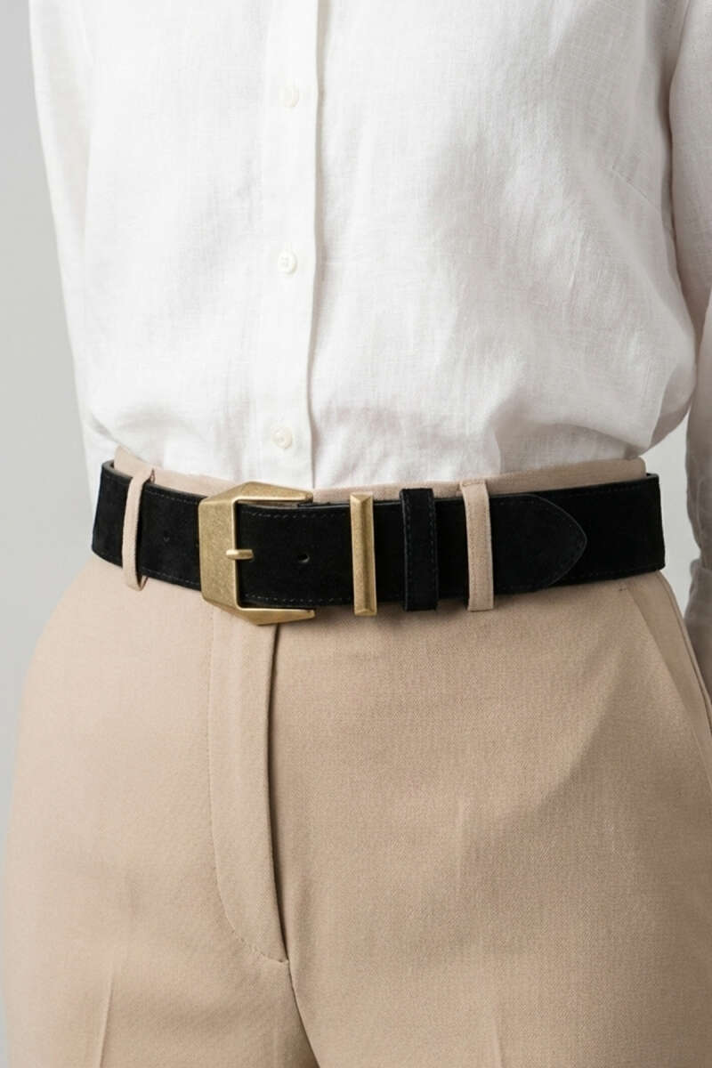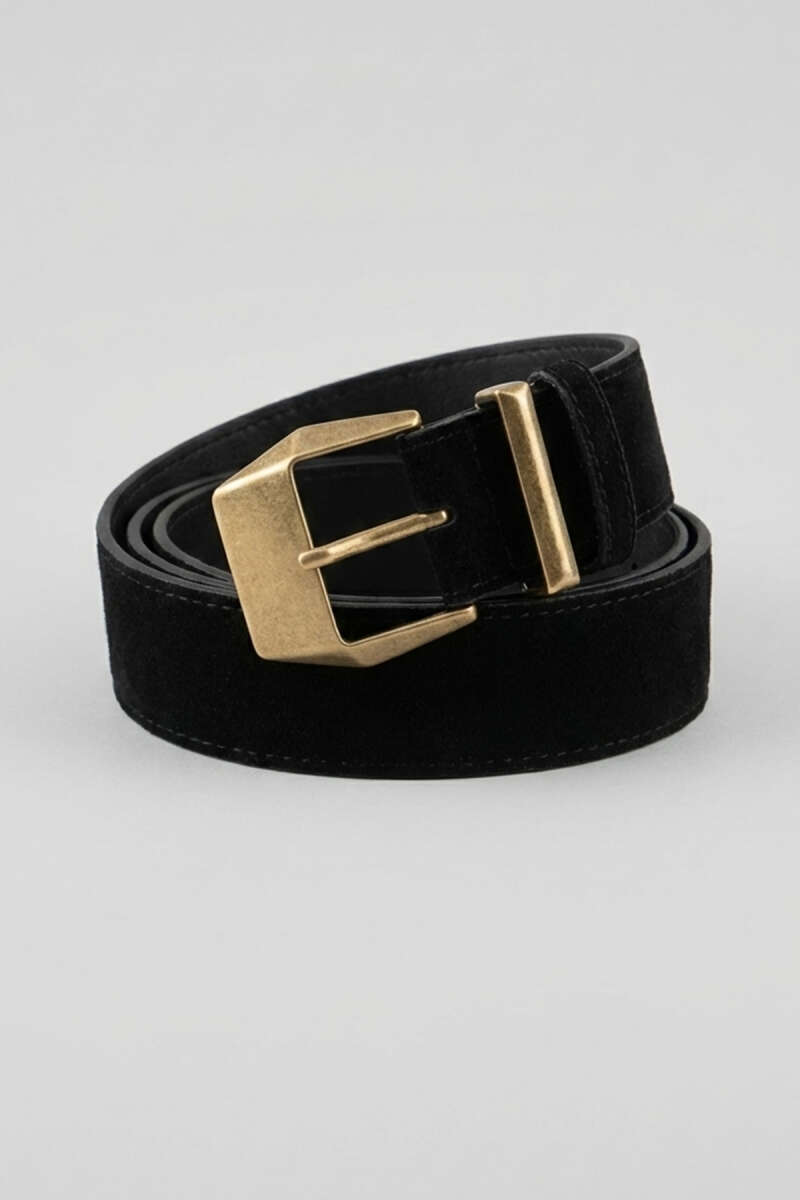 Kare Detaylı Gold Tokalı Süet Kemer Siyah
