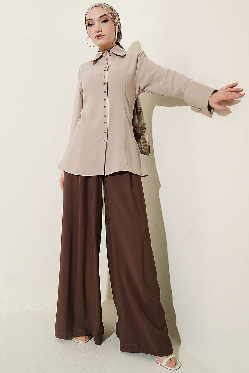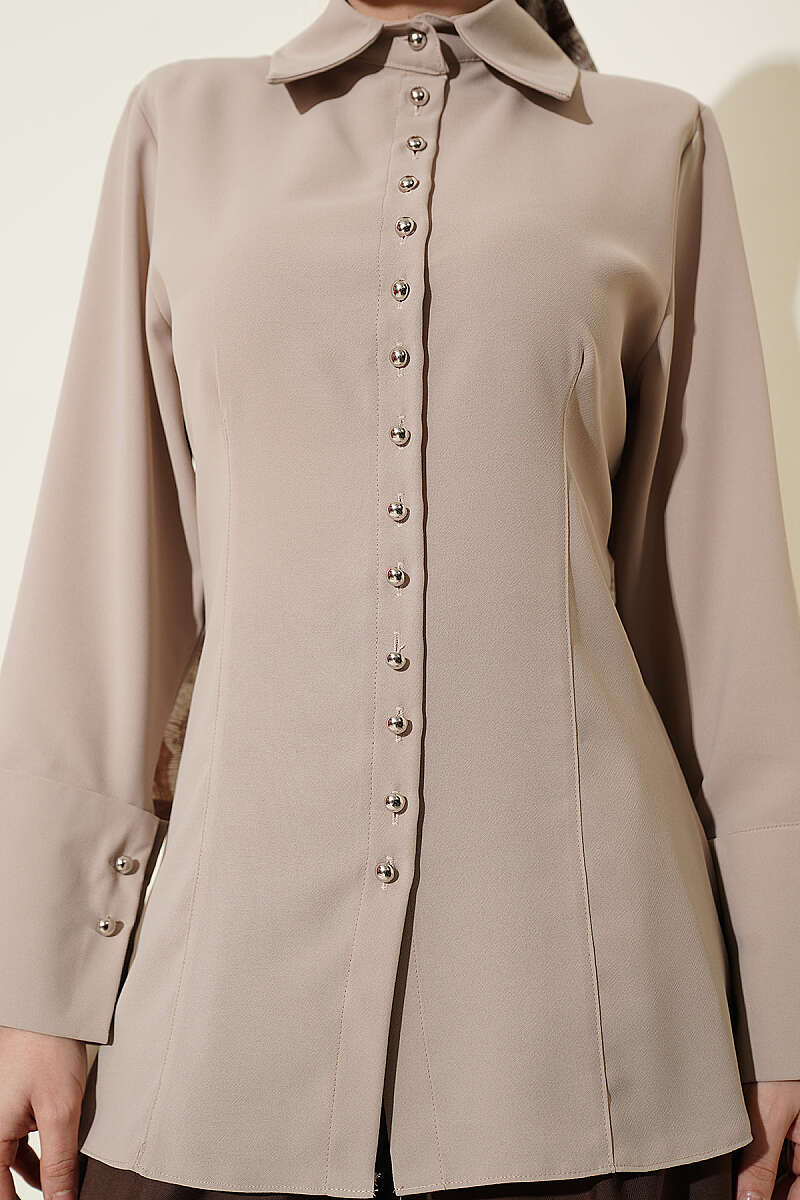 Top Düğmeli Dikiş Detaylı Gömlek Bej
