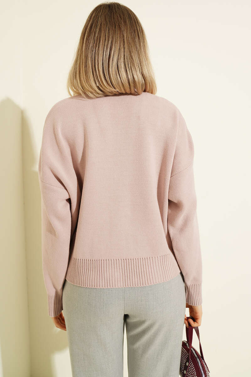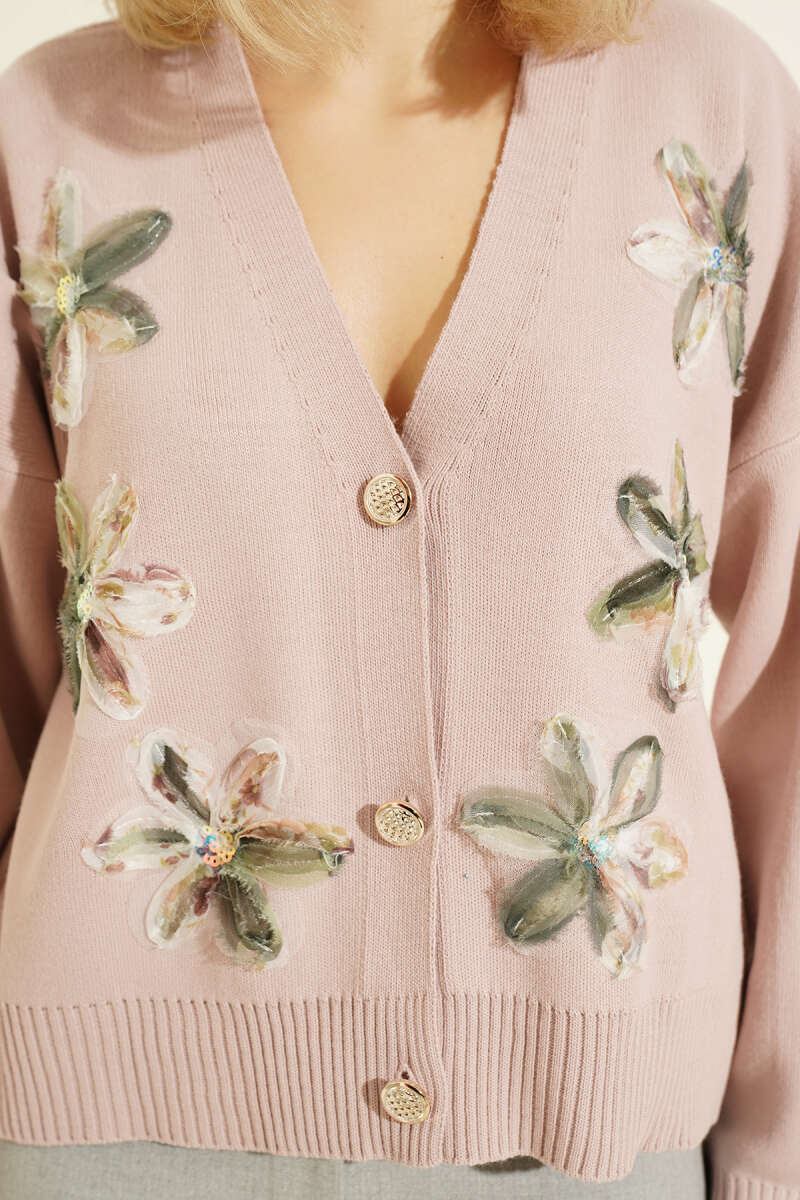 Tül Çiçekli Düğmeli Triko Kısa Hırka Pudra Yeşil