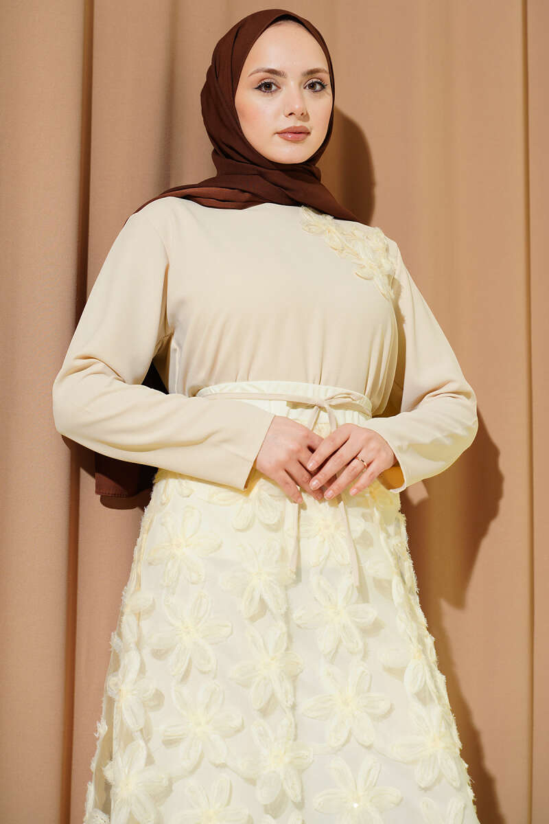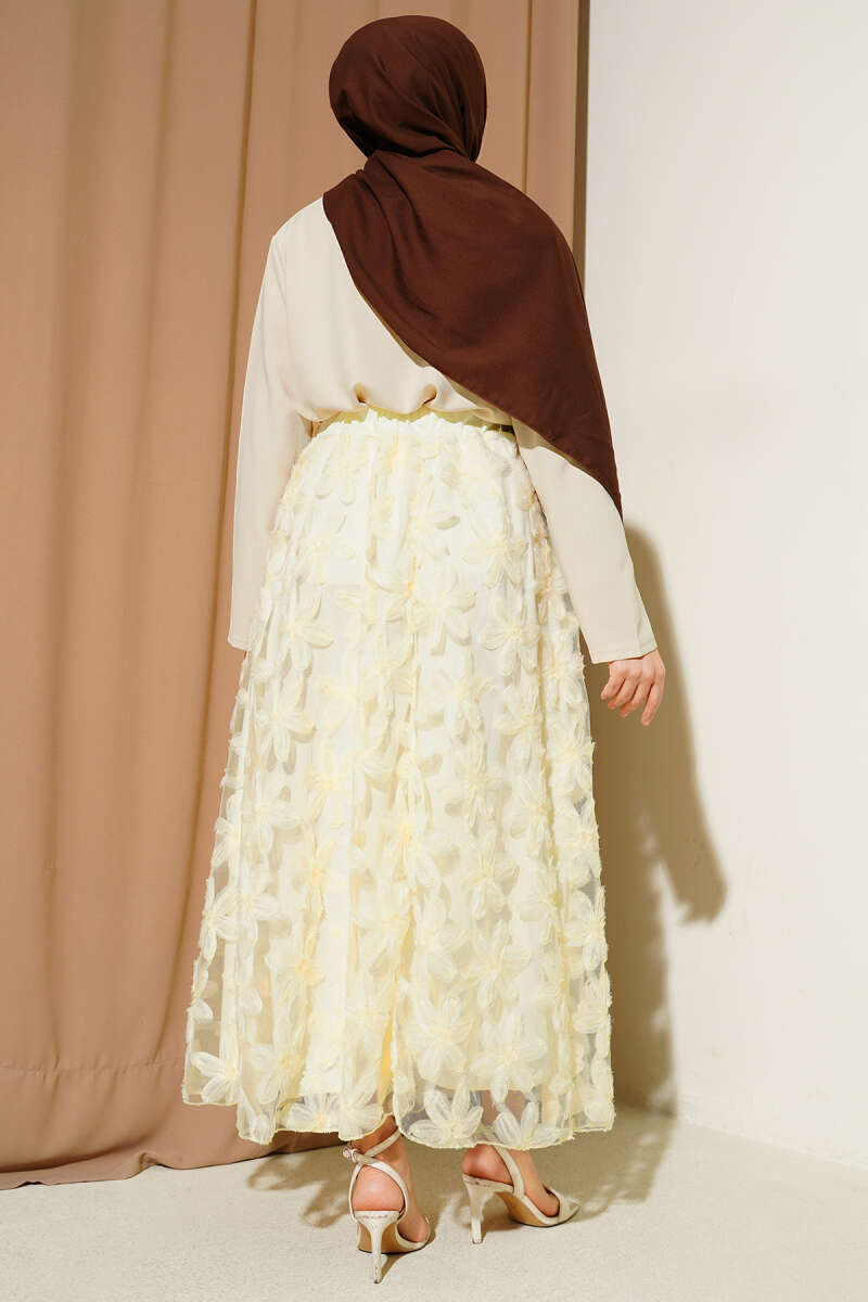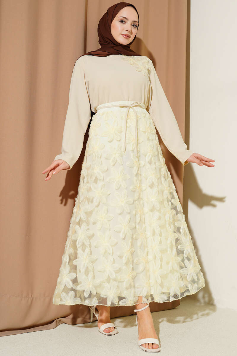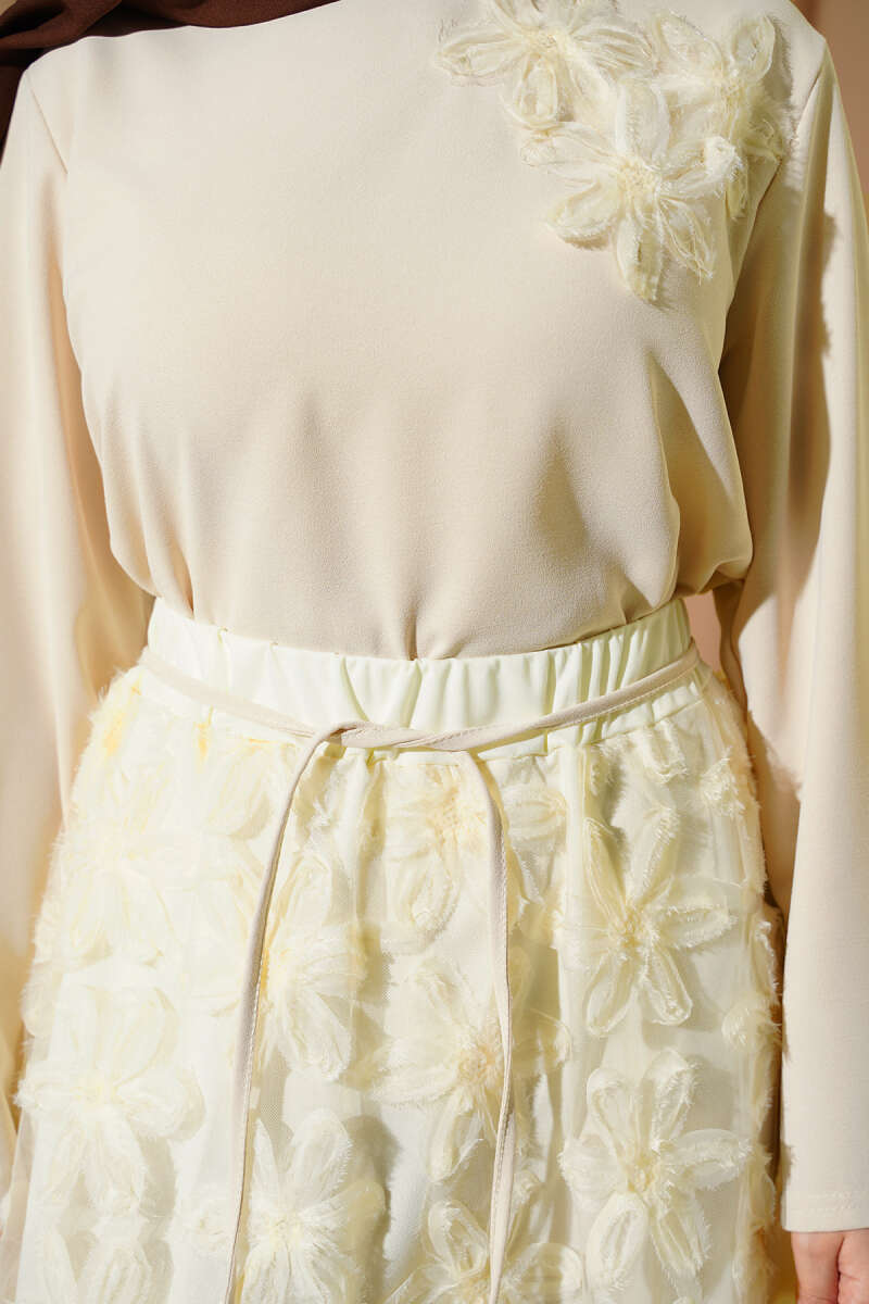 Tül Çiçekli Etekli İkili Takım Bej