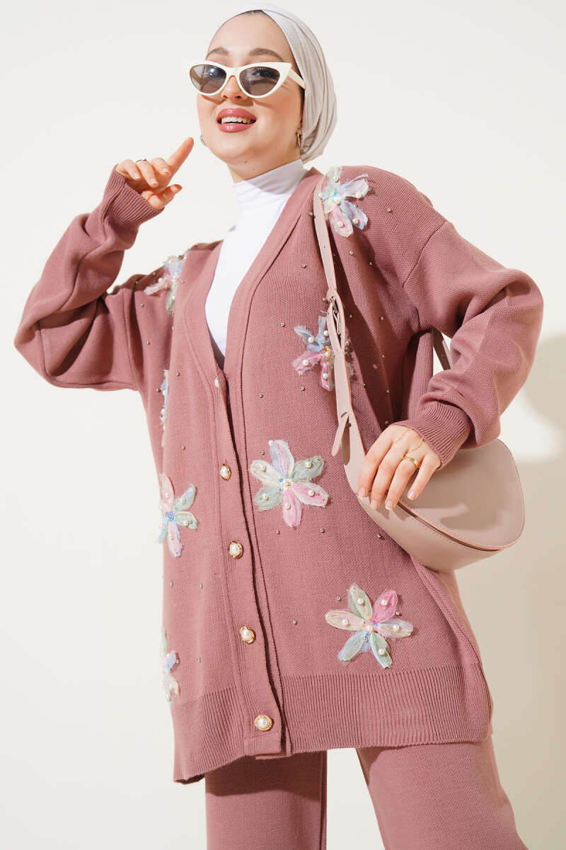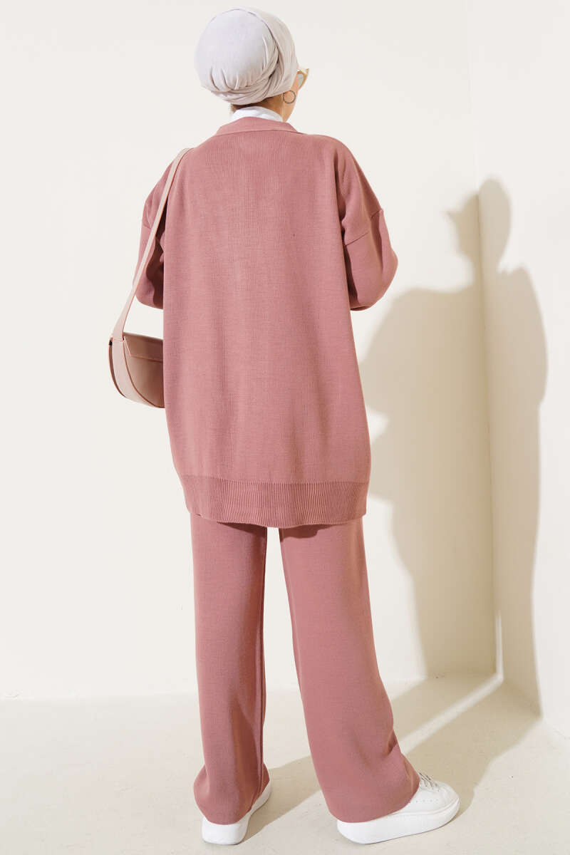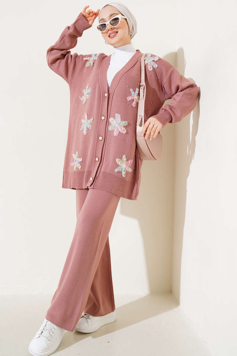 Taşlı Baklava Desen Triko İkili Takım Kahve