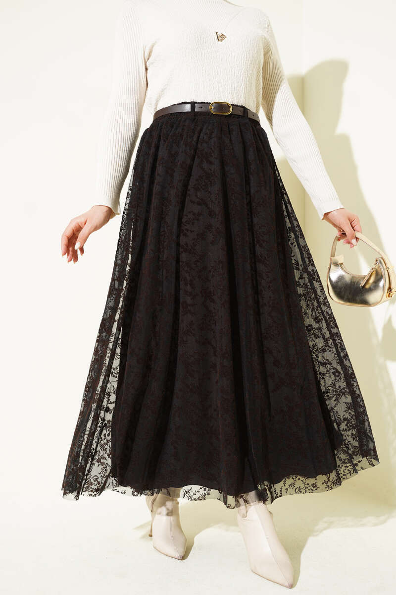 Tül Çiçekli Kemerli Etek Siyah