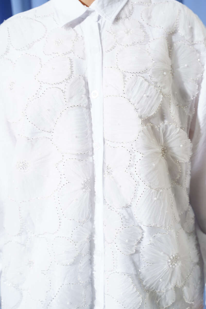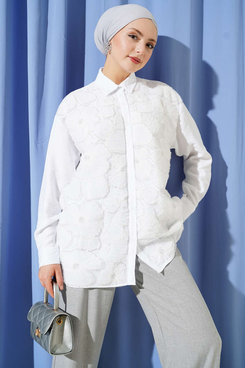 Omuz Pelerinli Taşlı Tensel Gömlek Mavi