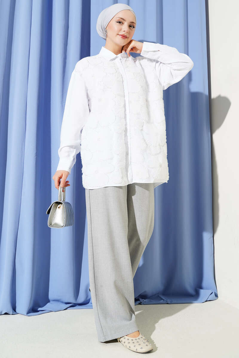 Omuz Pelerinli Taşlı Tensel Gömlek Vizon