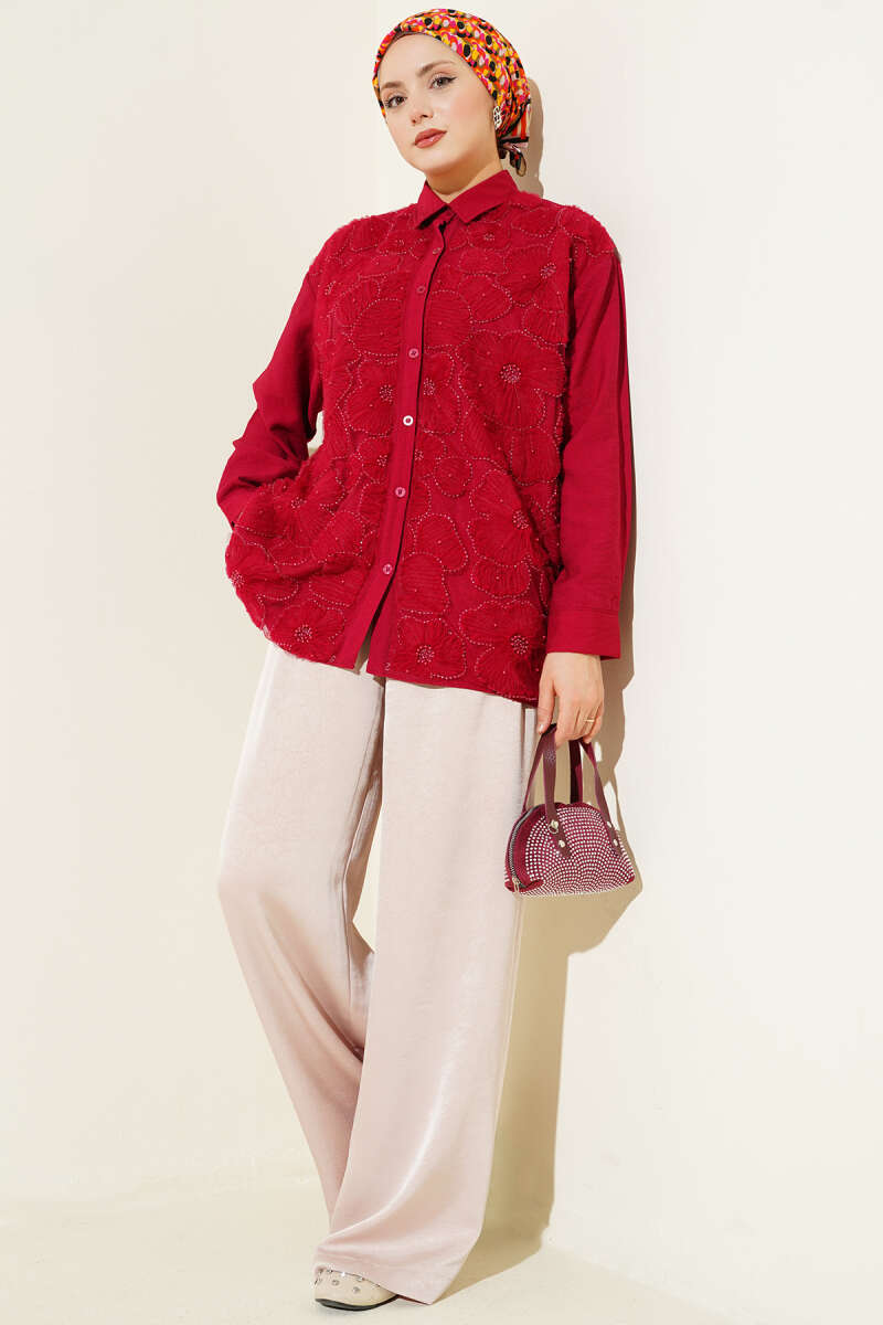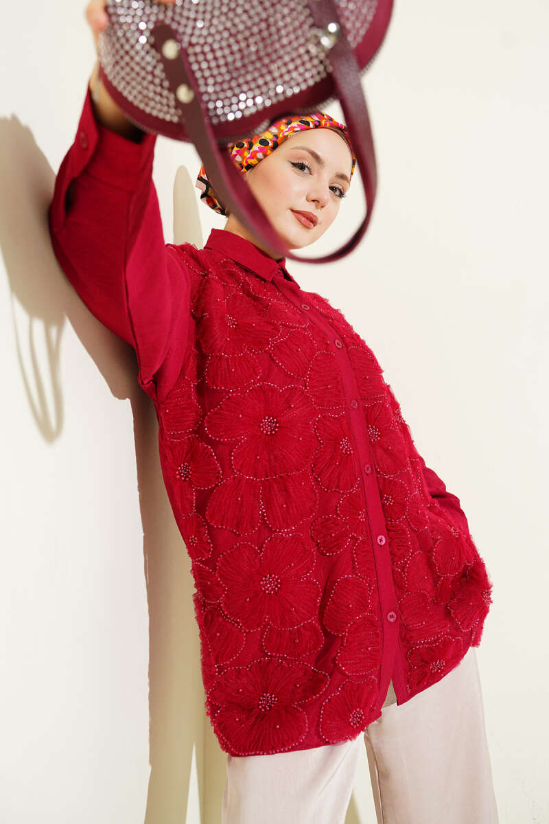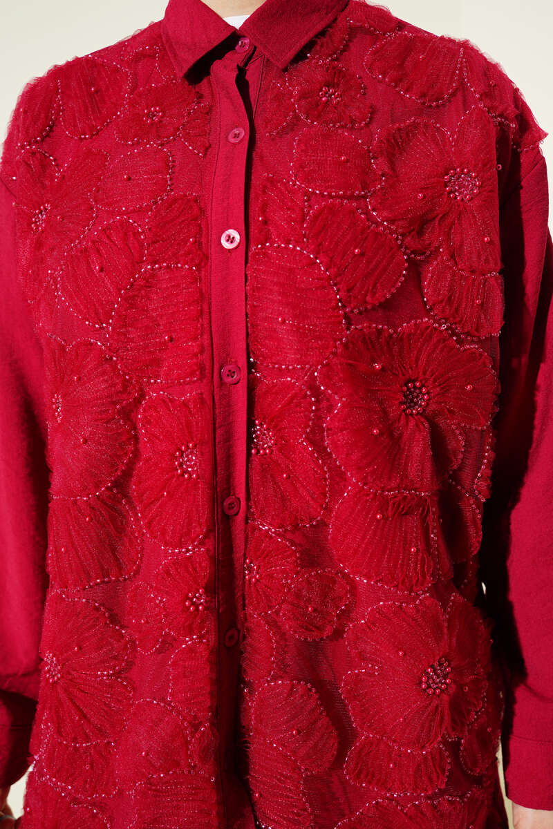 Tül Çiçekli Taş Süslemeli Gömlek Bordo