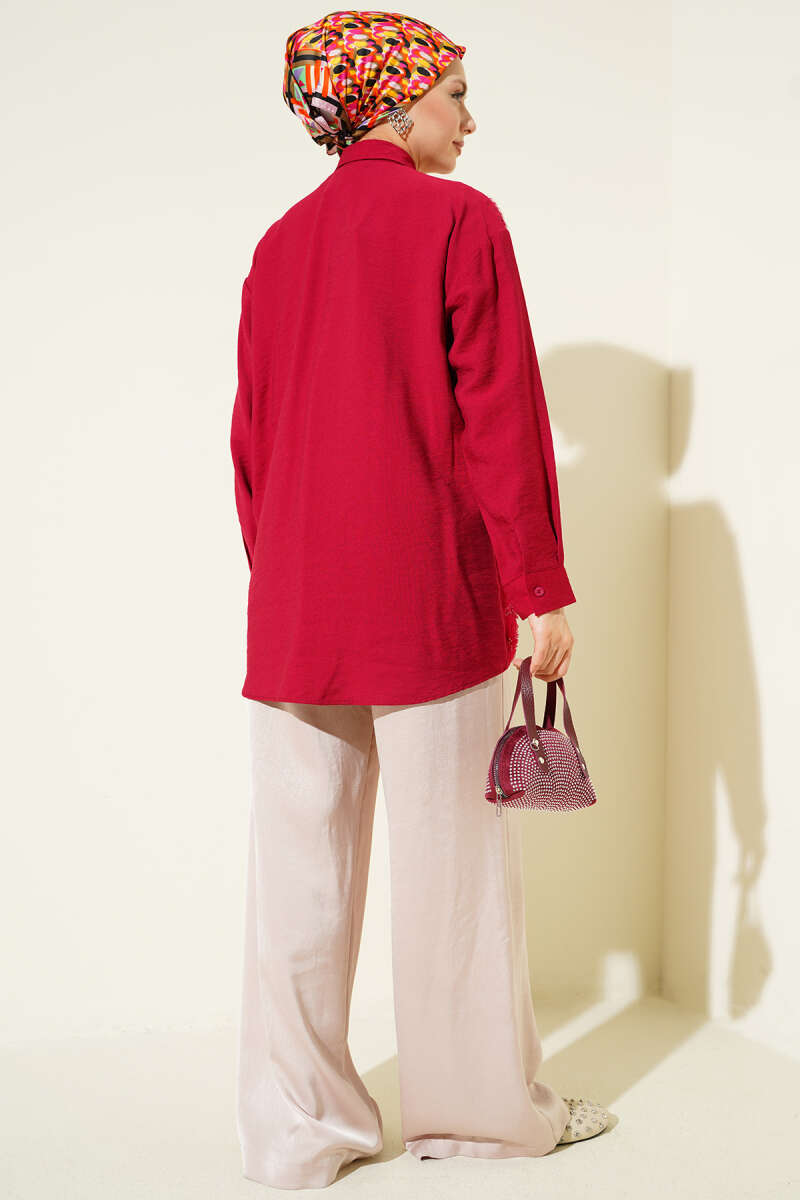Geniş Kuşaklı Büzgülü Gömlek Bordo