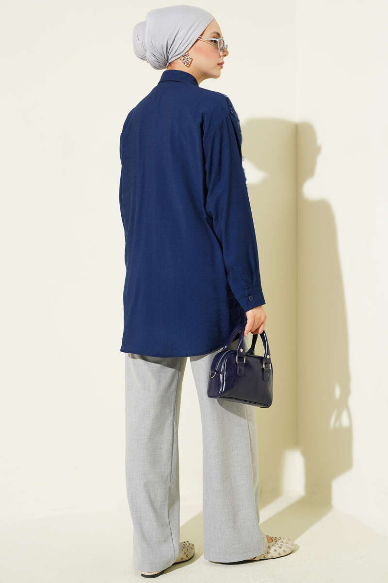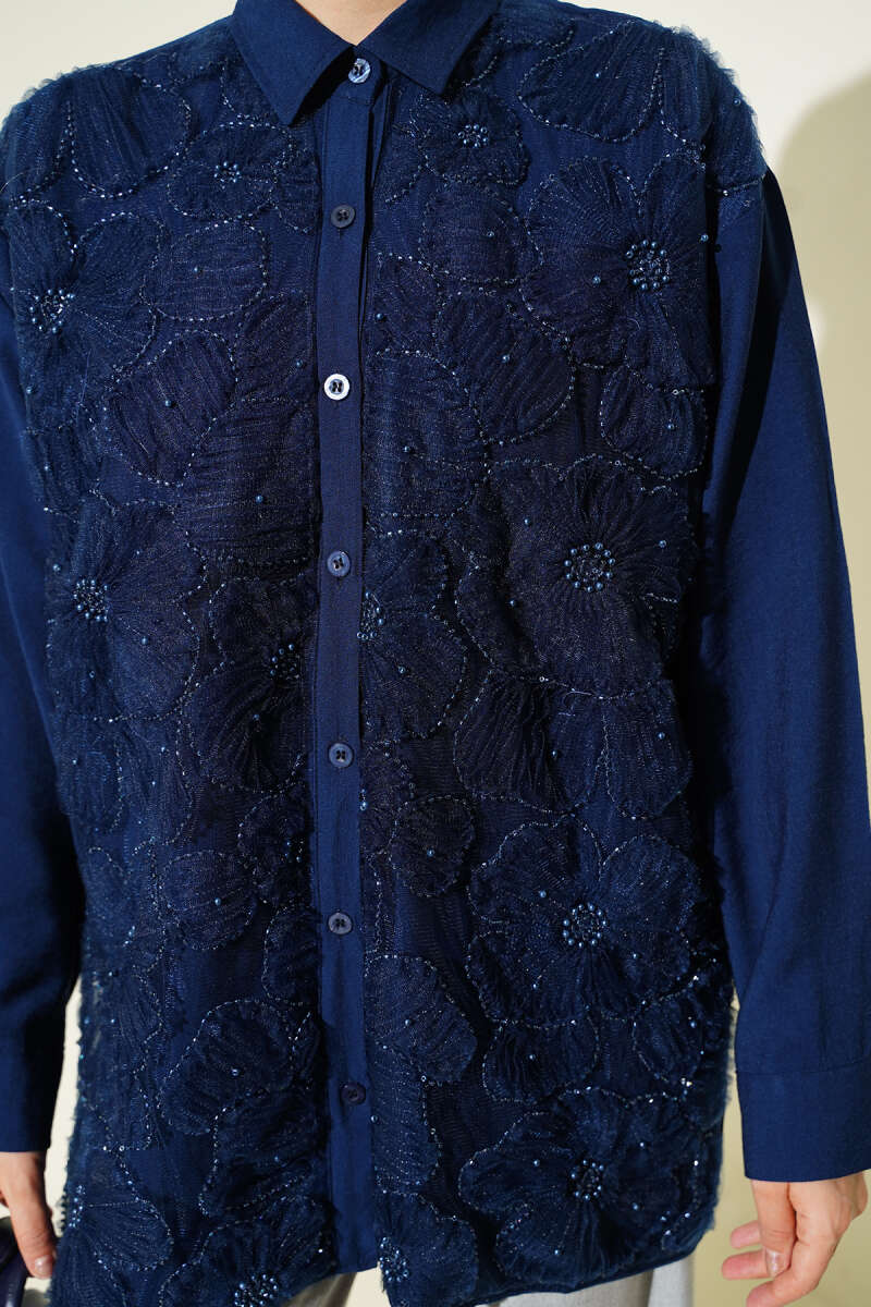 Tül Çiçekli Taş Süslemeli Gömlek Lacivert