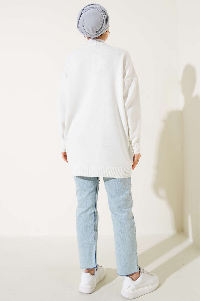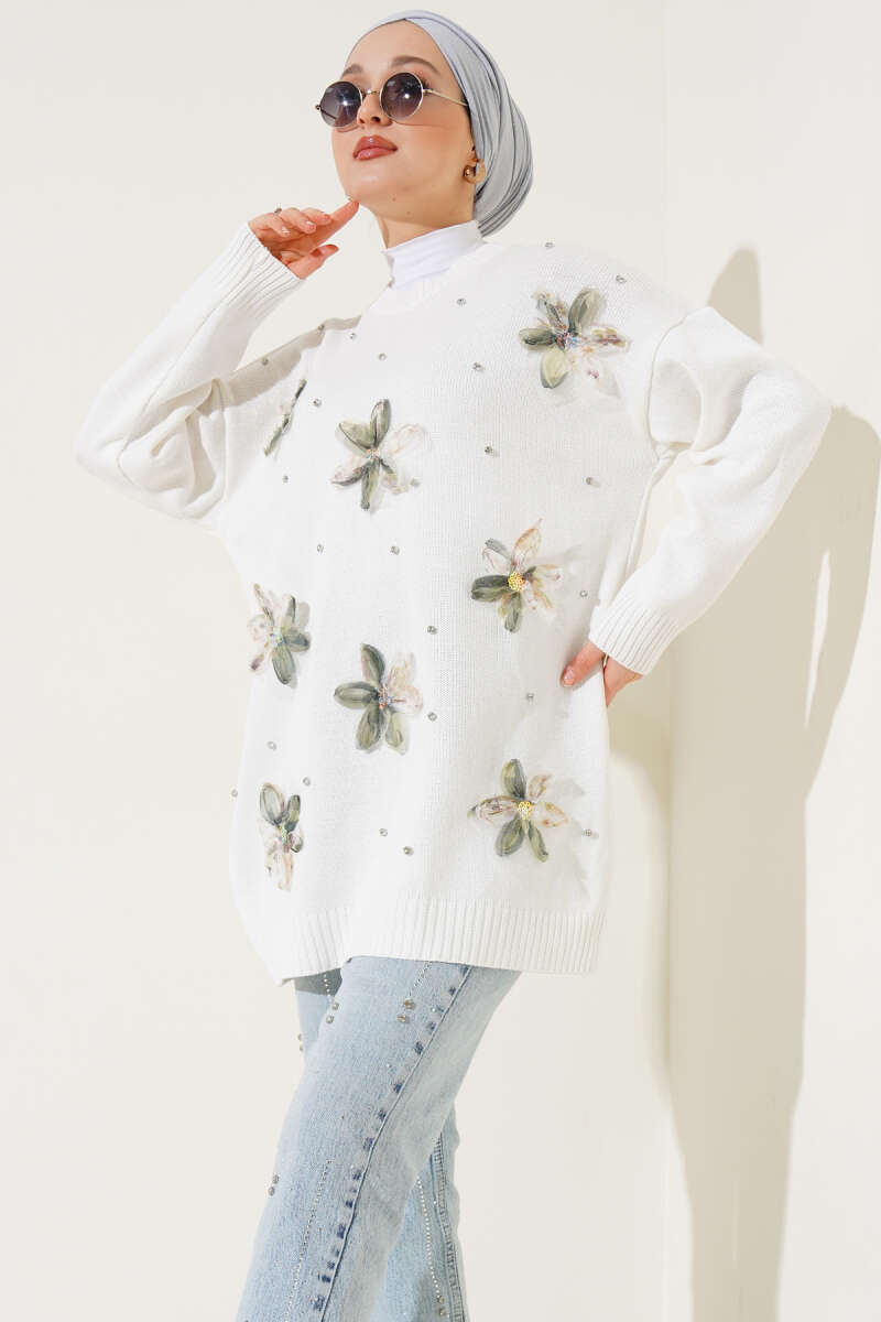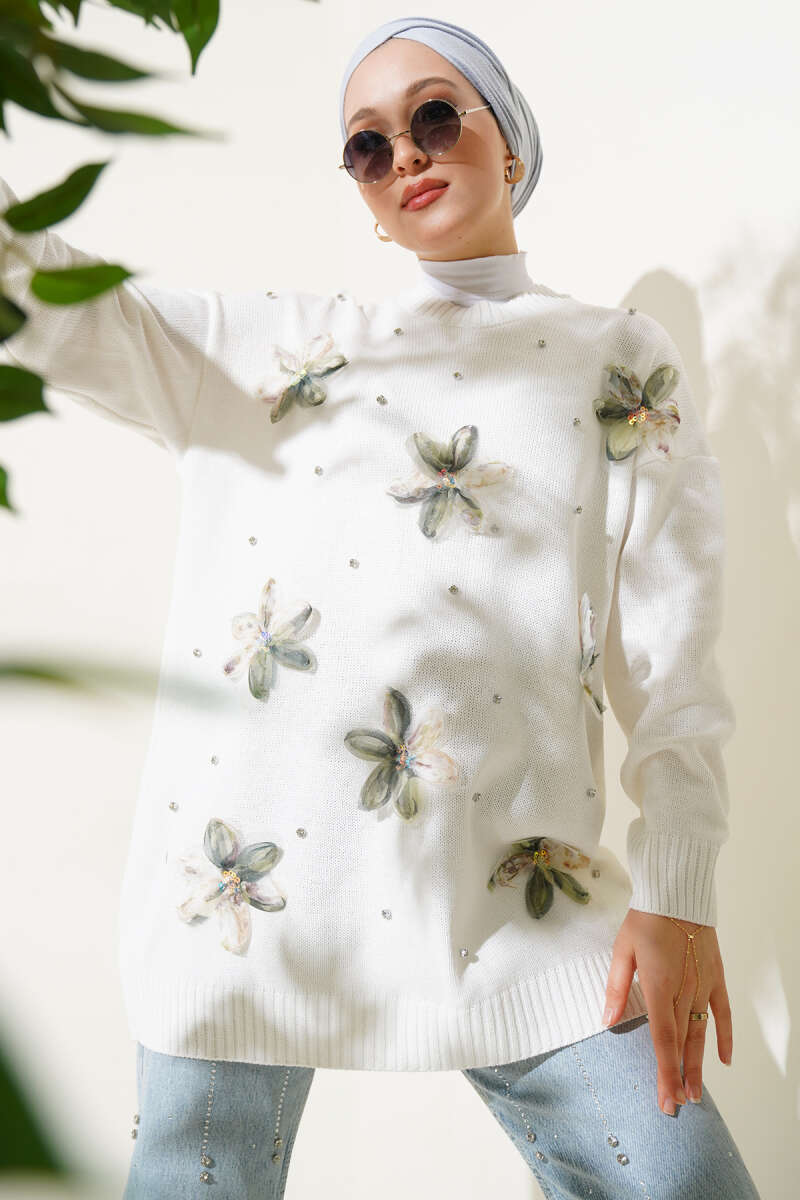 Yaka Fularlı Yumoş Triko Tunik Ekru