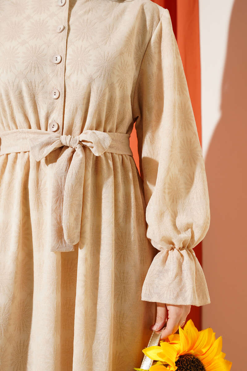 Boydan Tahta Düğmeli Kuşaklı Tensel Elbise Pembe