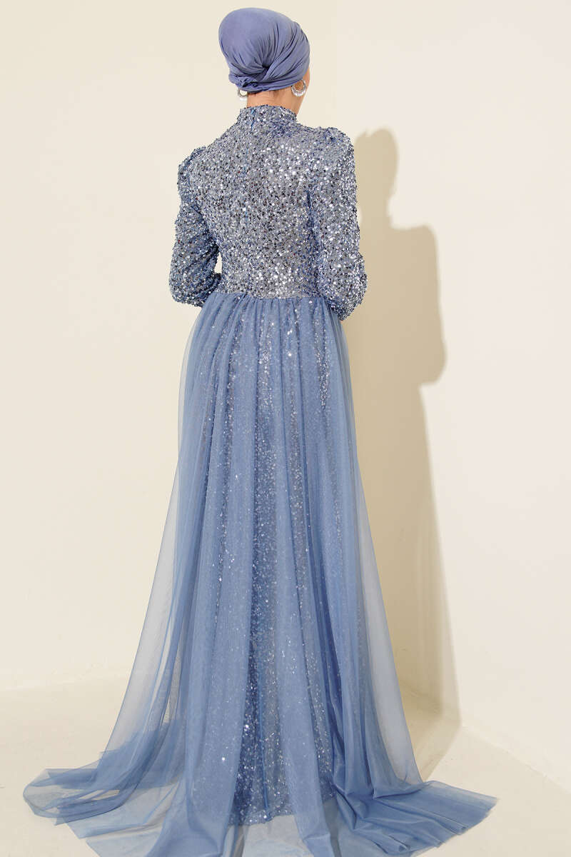 Bel Büzgü Detaylı Saten Abiye Elbise Lacivert