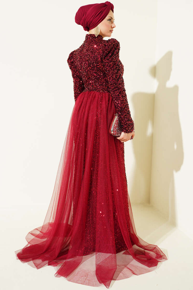 Büzgü Detaylı Simli Abiye Elbise Bordo