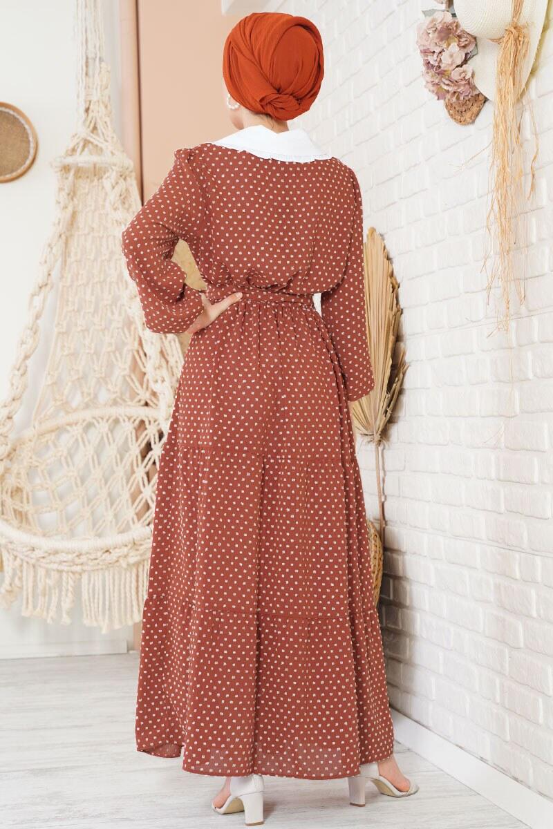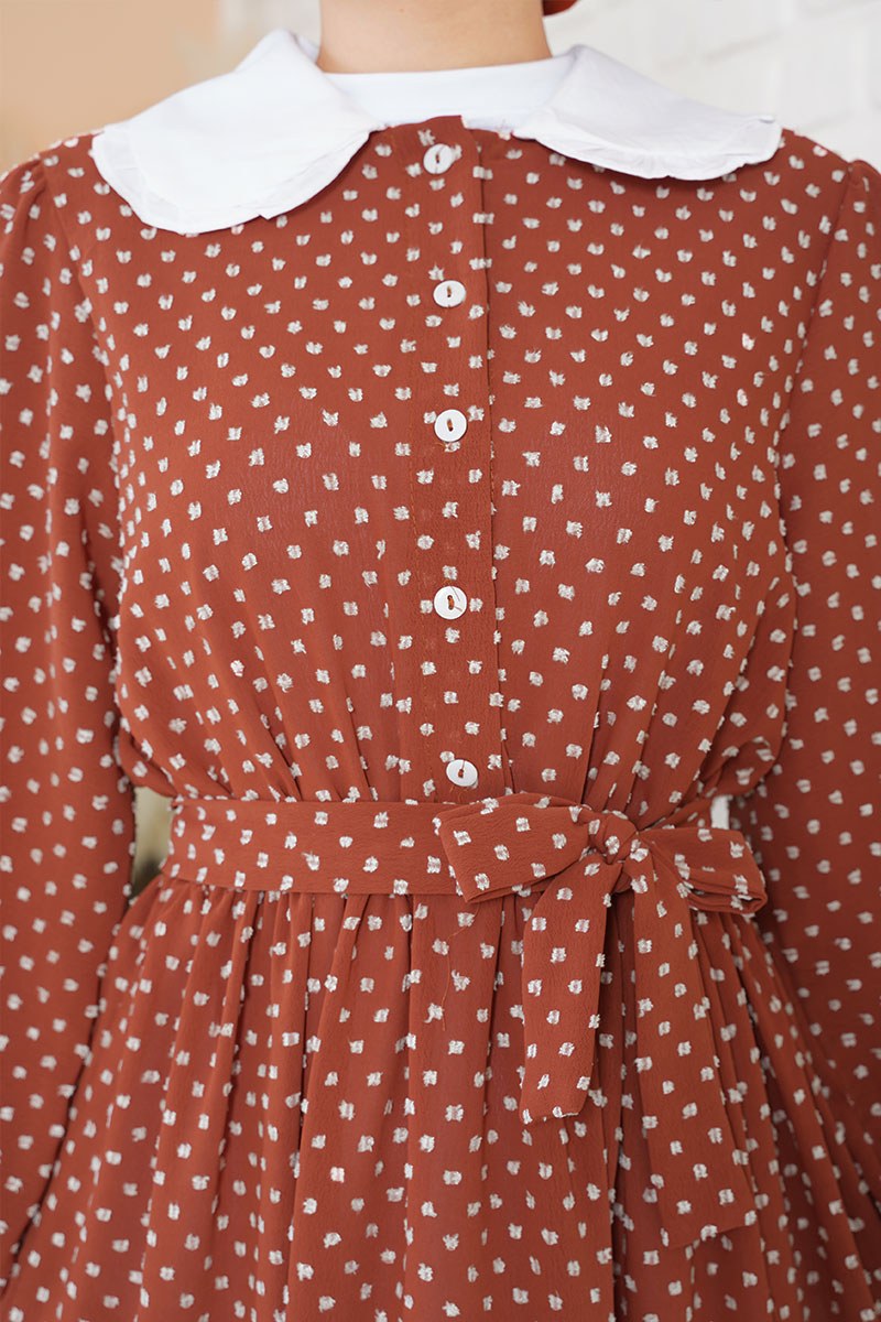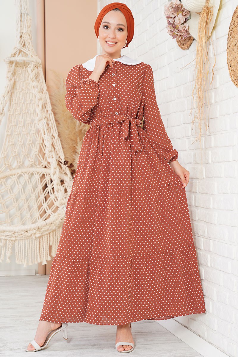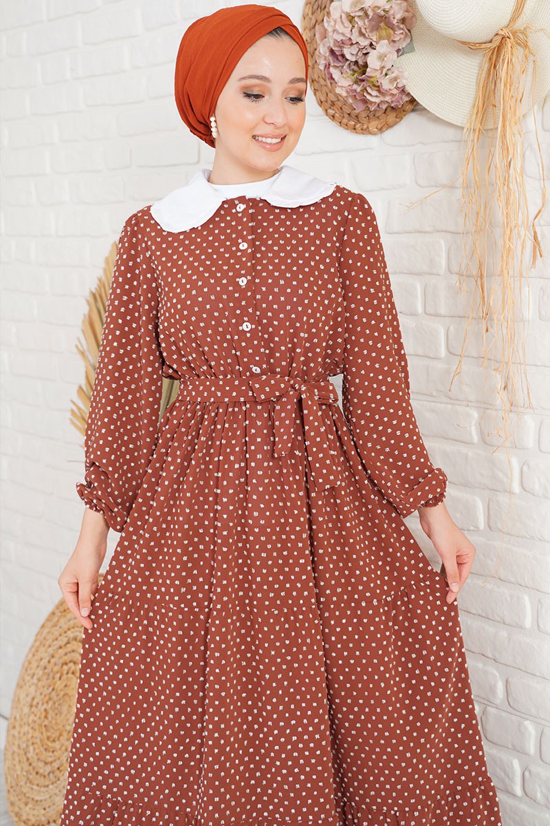 Yeni sezon model olan kiremit renkli elbise tüvit görünüme sahiptir. Bebe yakalı olan elbisenin önündeki düğmeler aktif kullanılabilirdir. Esnek lastik kolludur. Etek ucundaki iki adet kat detayı hoş bir görünüm sağlamaktadır. Beli esnek lastikli olan elbisenin iki adet kemer köprüsü bulunmaktadır. Kendi deseninden kuşak elbiseye aittir. Astarsızdır. Renk seçenekleri bulunmaktadır.