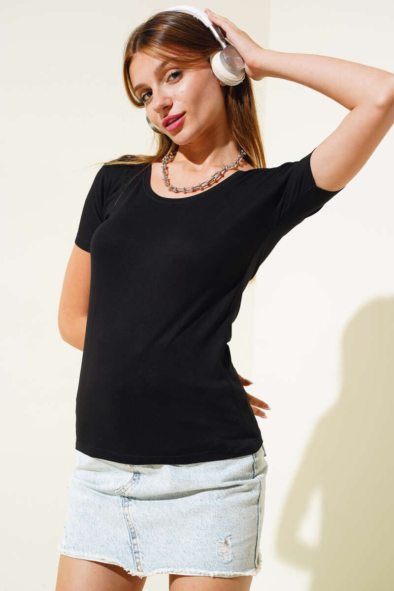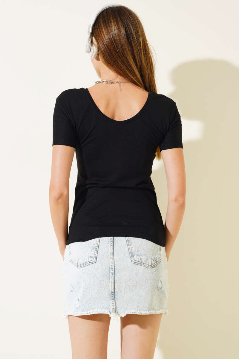 Bisiklet Yaka Tokalı Fitilli Bluz Siyah