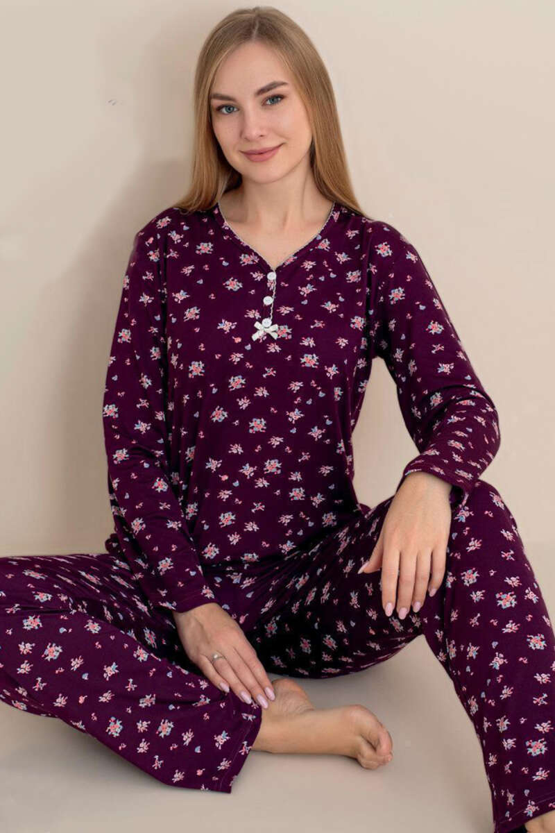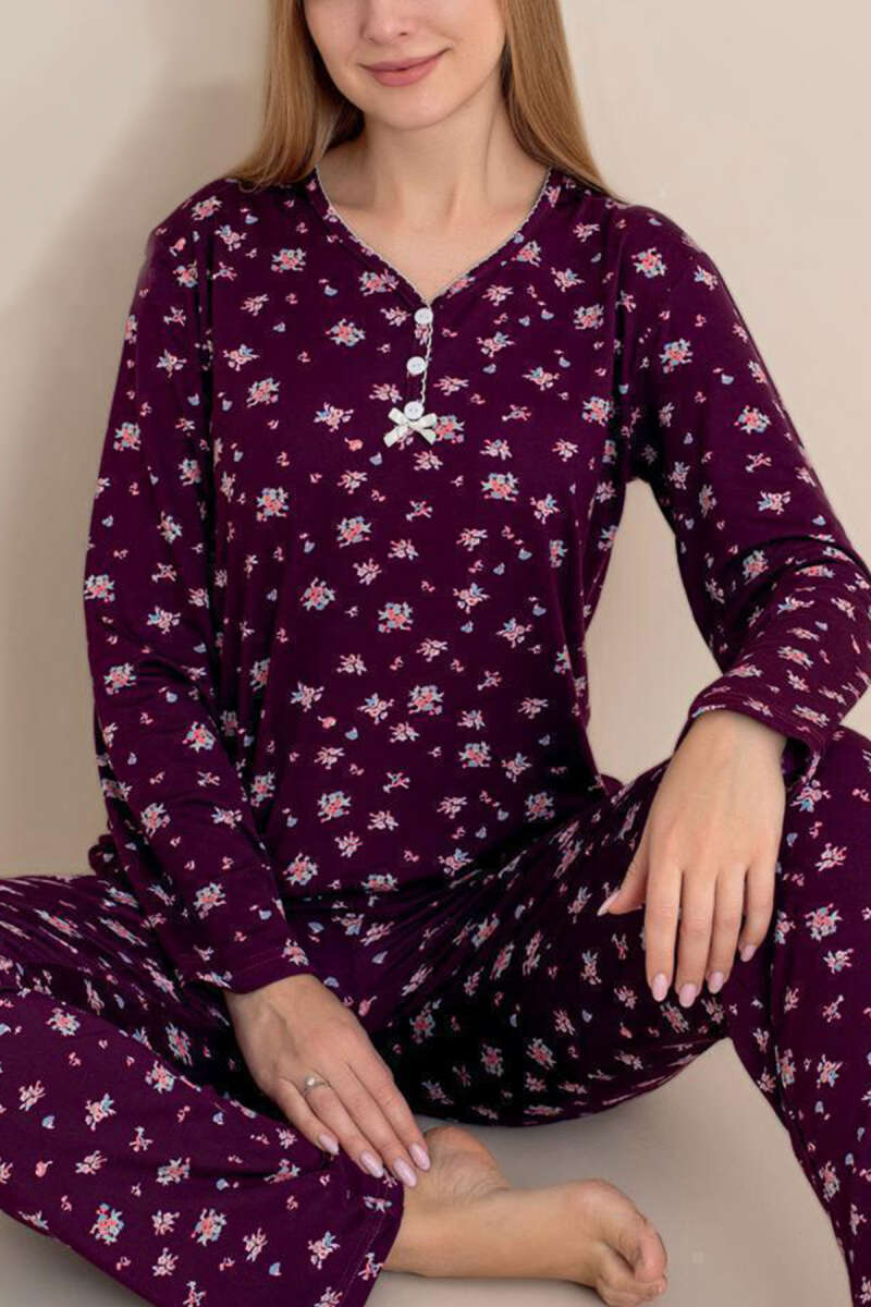 Üç Düğmeli Çiçekli Pijama Takımı Mürdüm