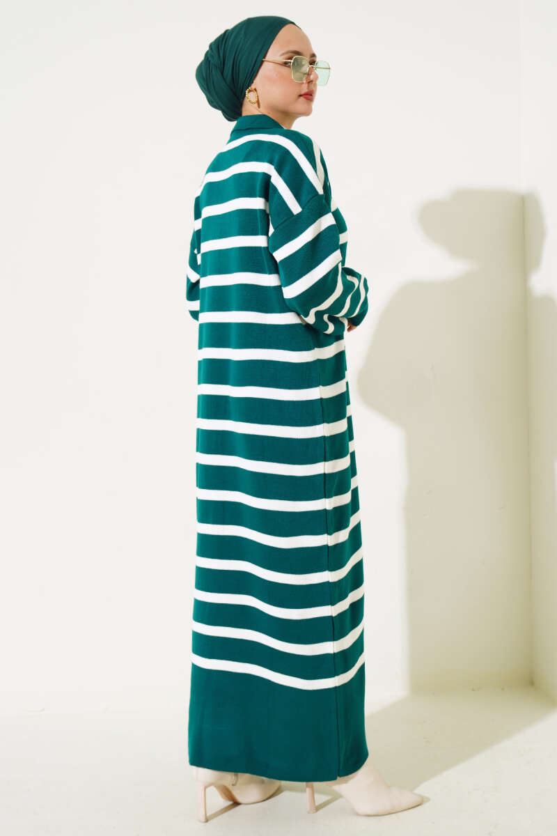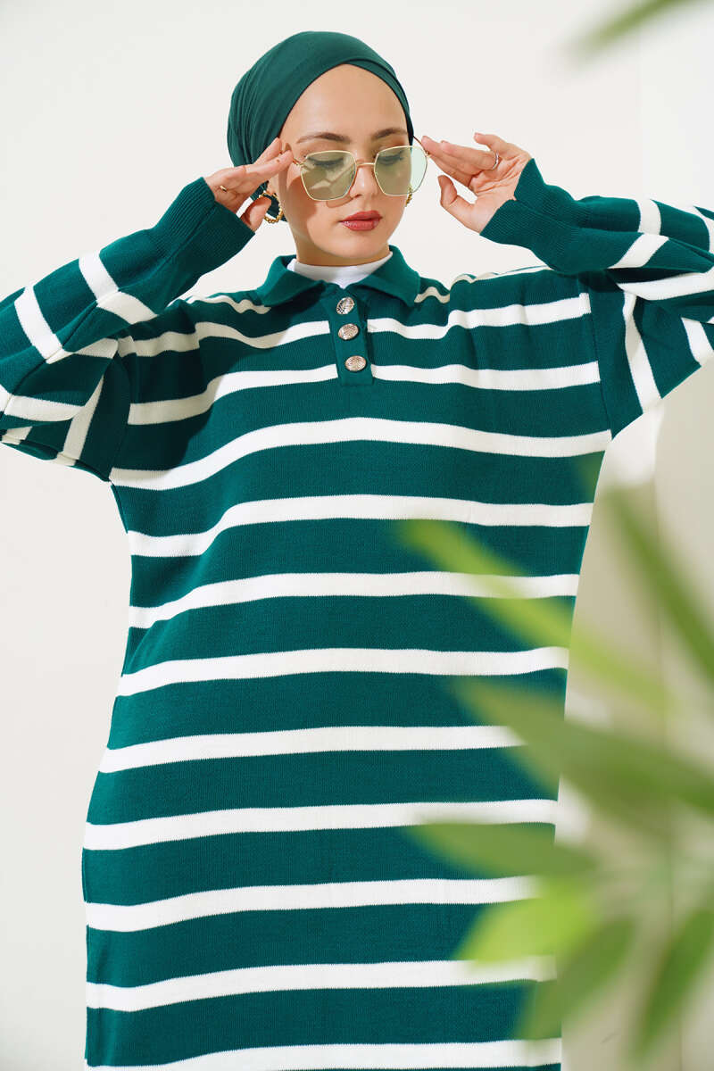 Üç Düğmeli Çizgili Triko Elbise Kahve