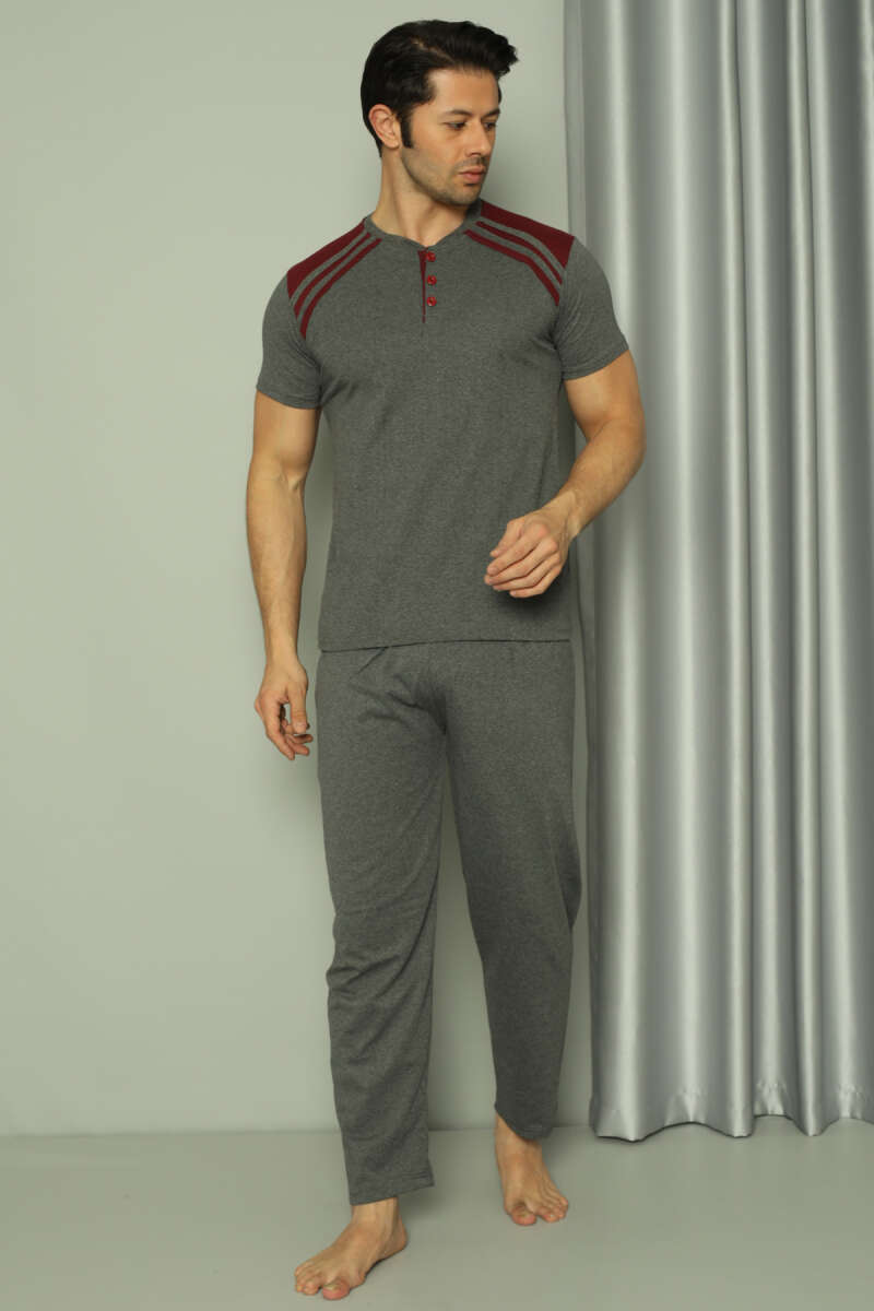 Üç Düğmeli Ekose Detaylı Kısa Kol Erkek Pijama Takımı Füme