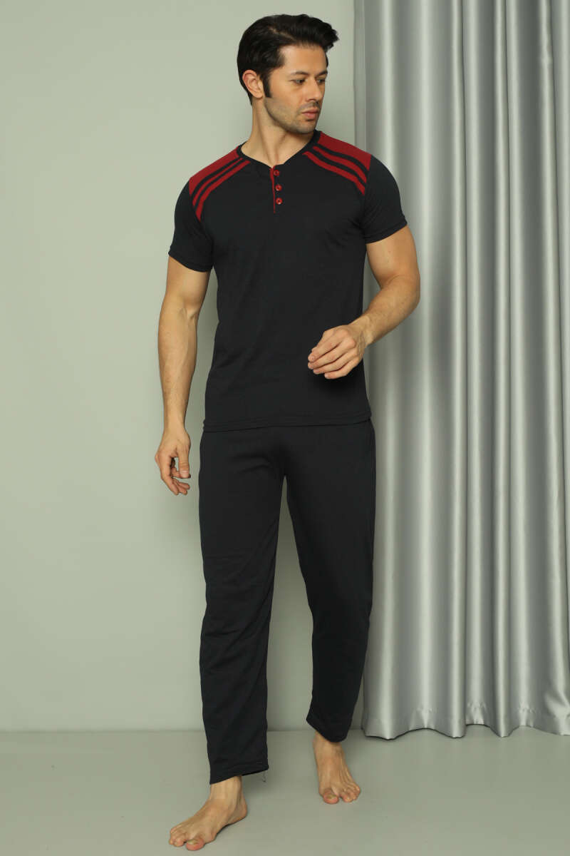 Üç Düğmeli Ekose Detaylı Kısa Kol Erkek Pijama Takımı Siyah