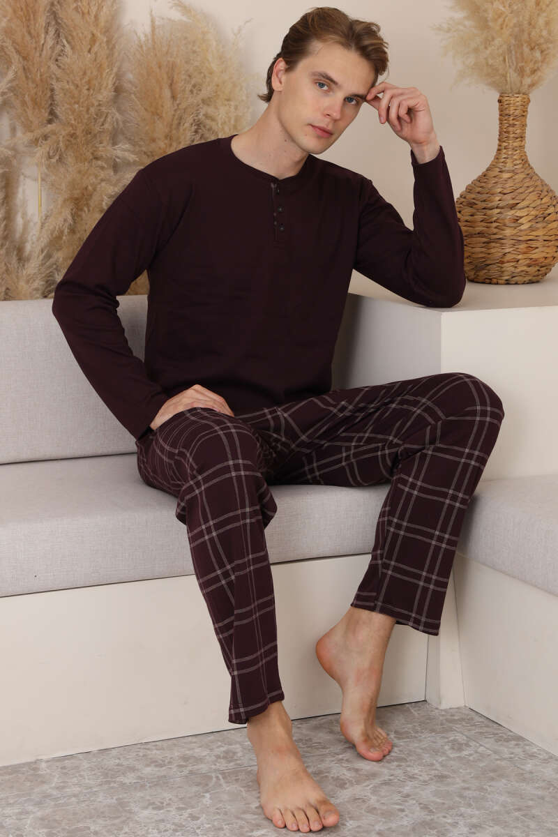 Üç Düğmeli Ekoseli Erkek Pijama Takımı Mürdüm