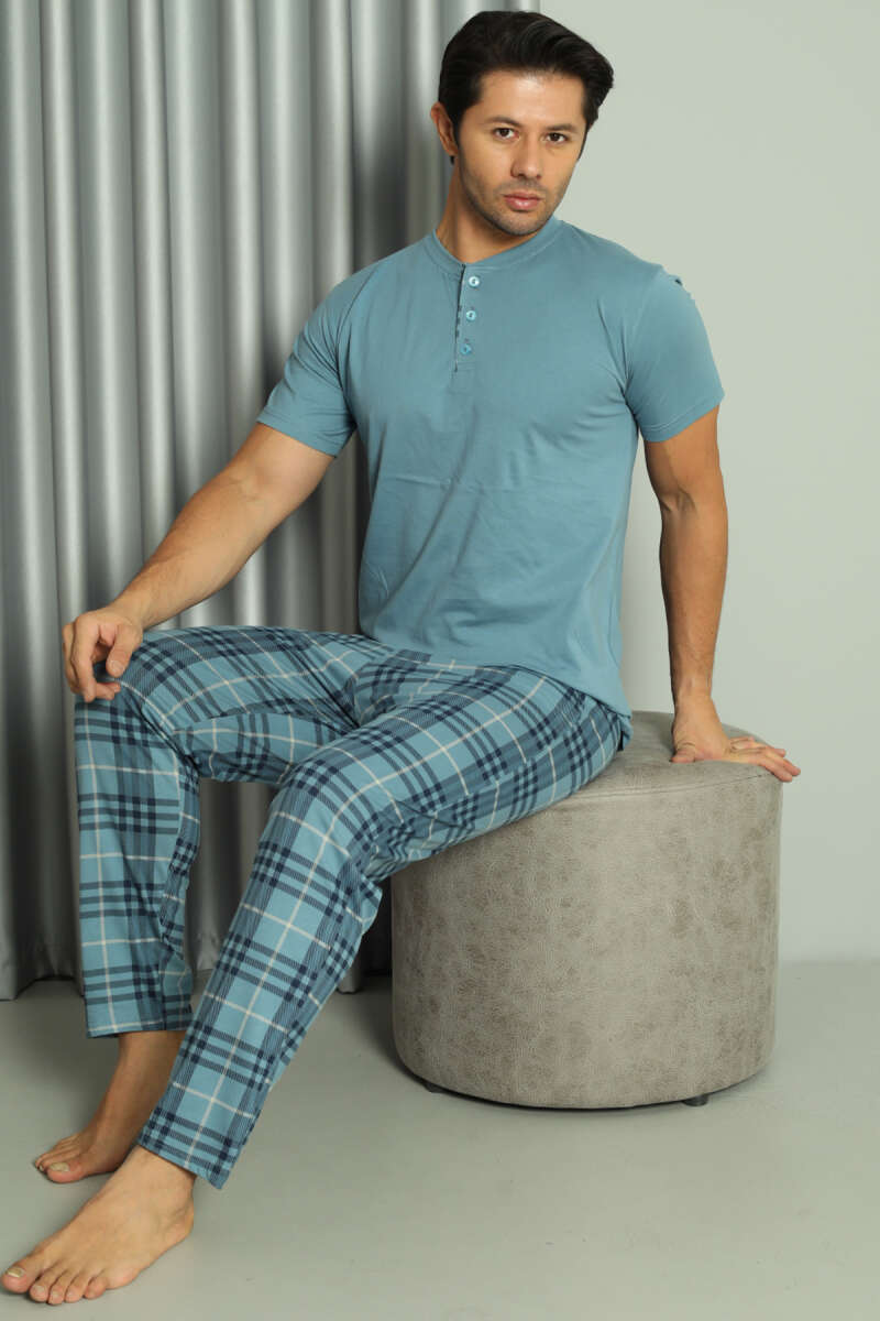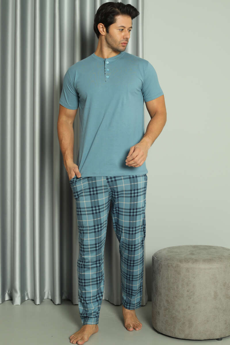 Üç Düğmeli Ekoseli Kısa Kol Erkek Pijama Takım Mavi