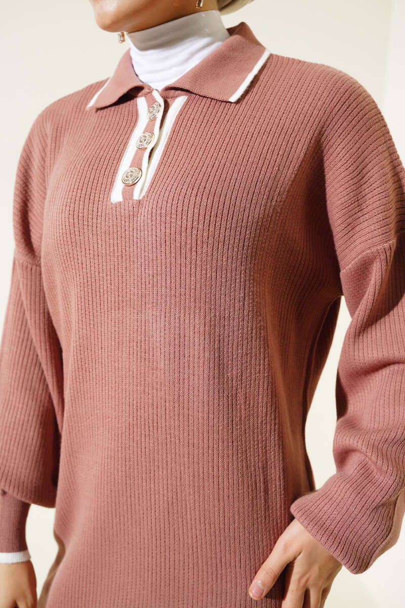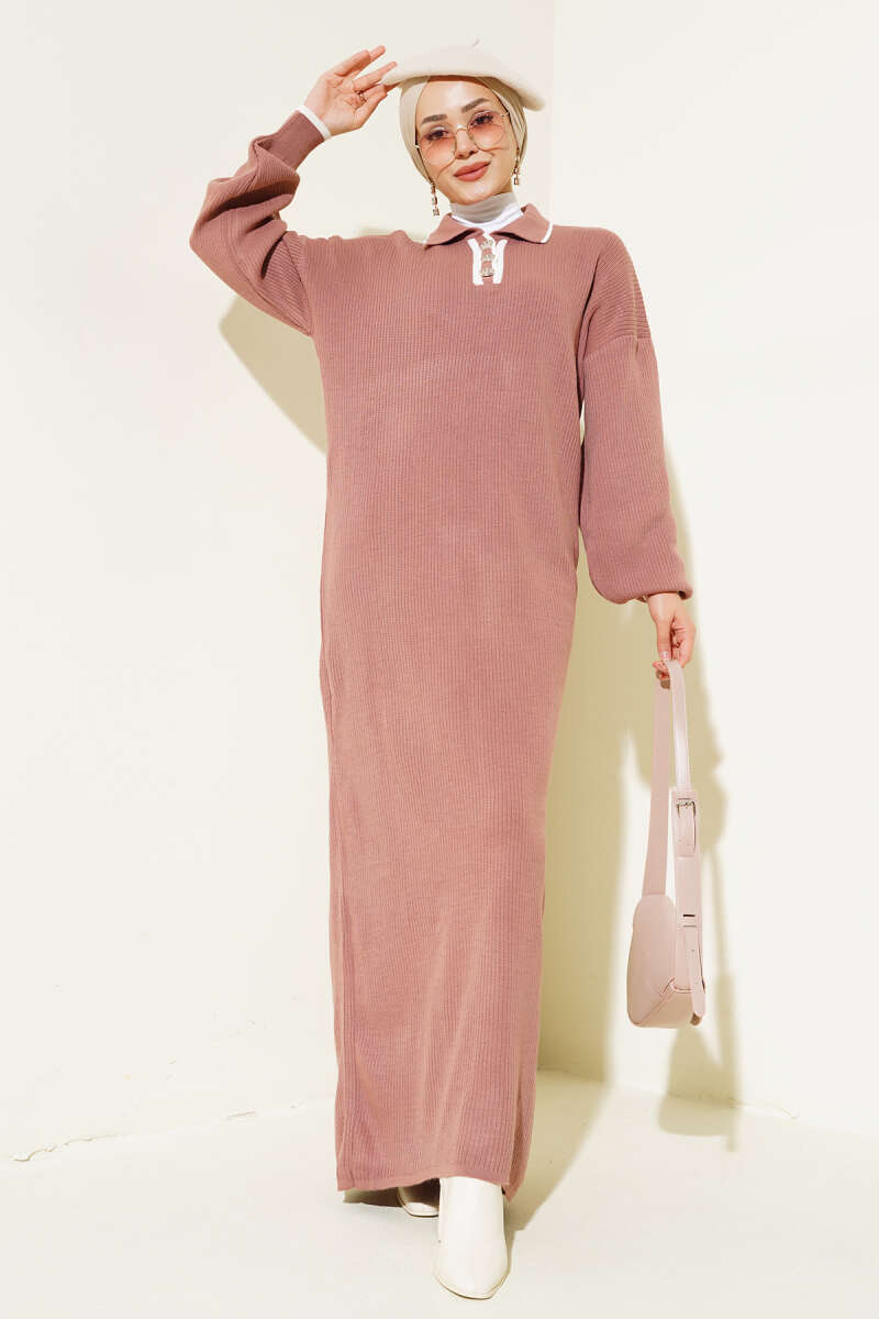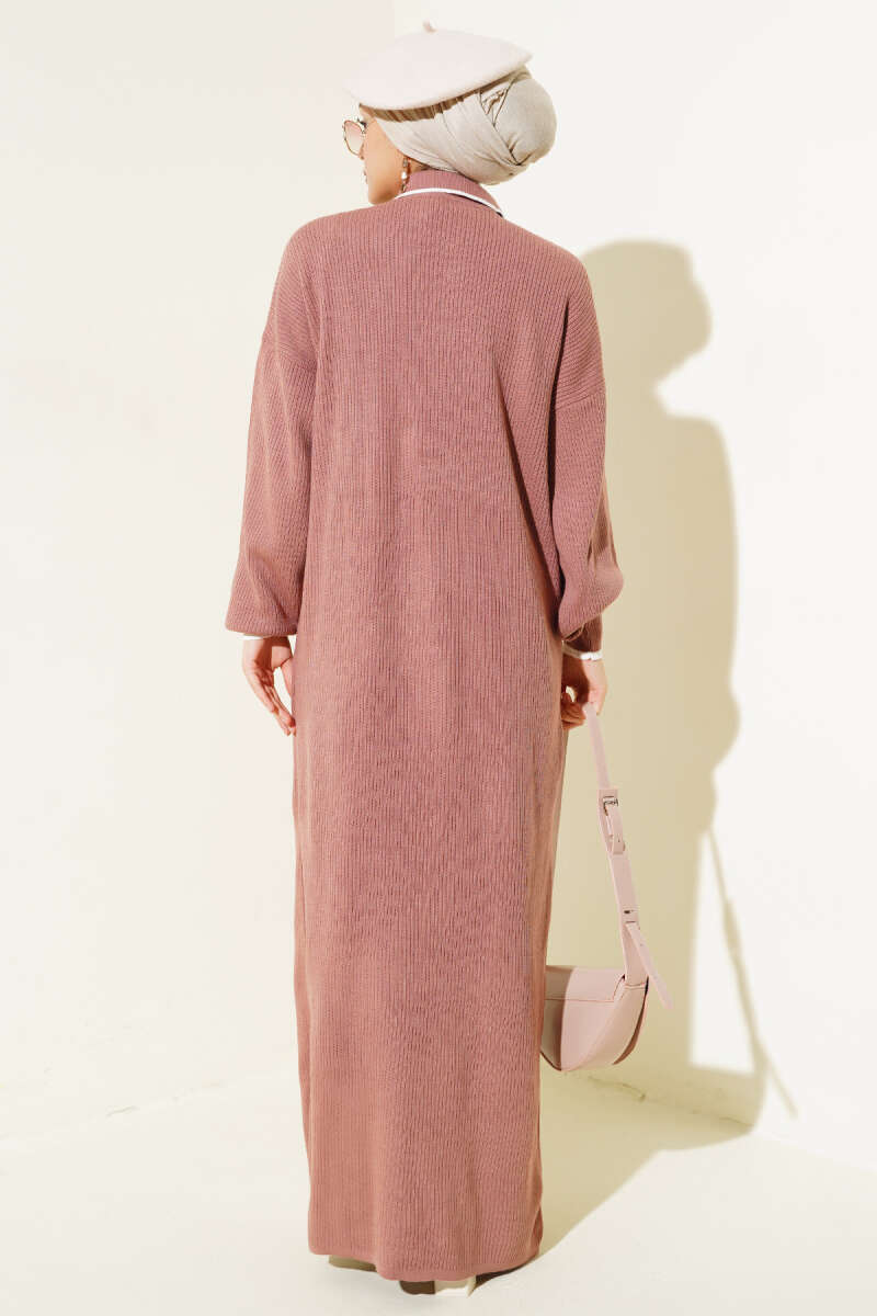 Üç Düğmeli Fitilli Triko Elbise Gül Kurusu