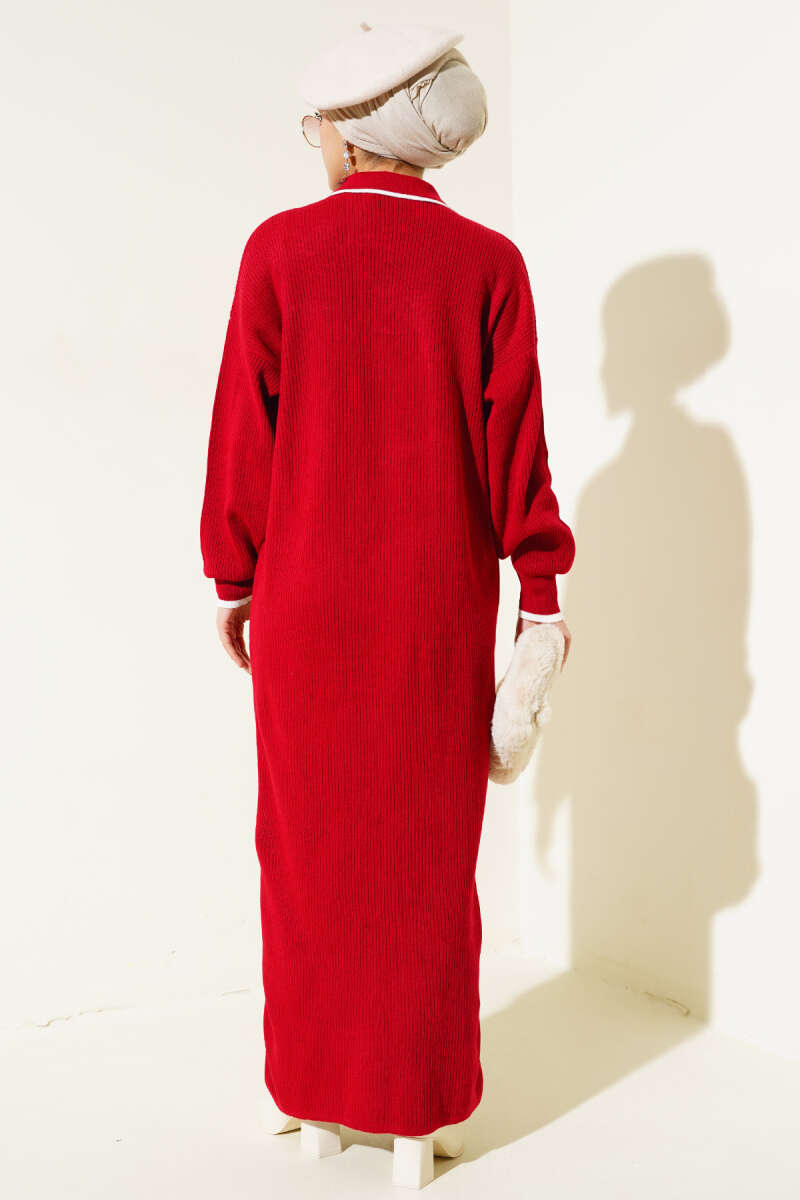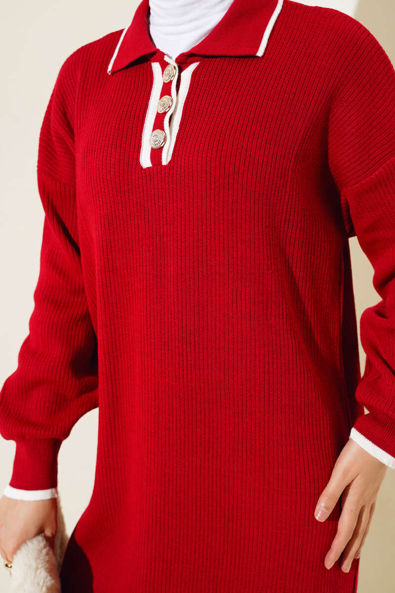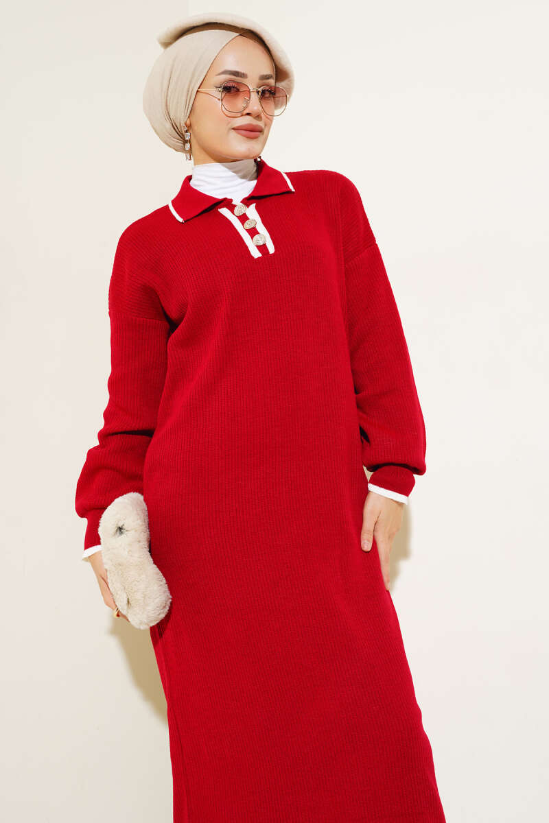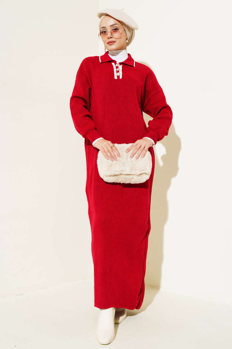 Gömlek Yaka Düğmeli Triko Elbise Bordo