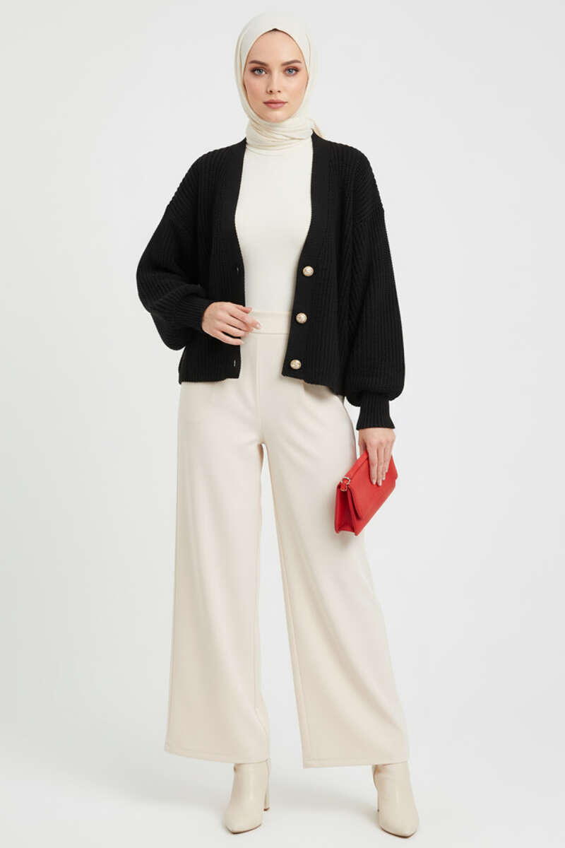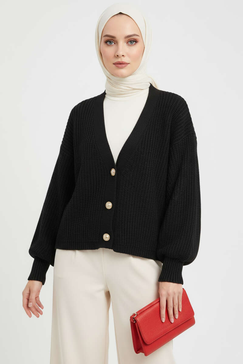 Gold Düğmeli Basic Sakallı Triko Hırka Siyah