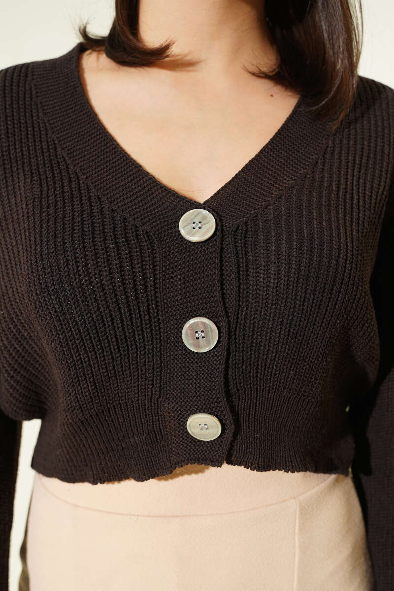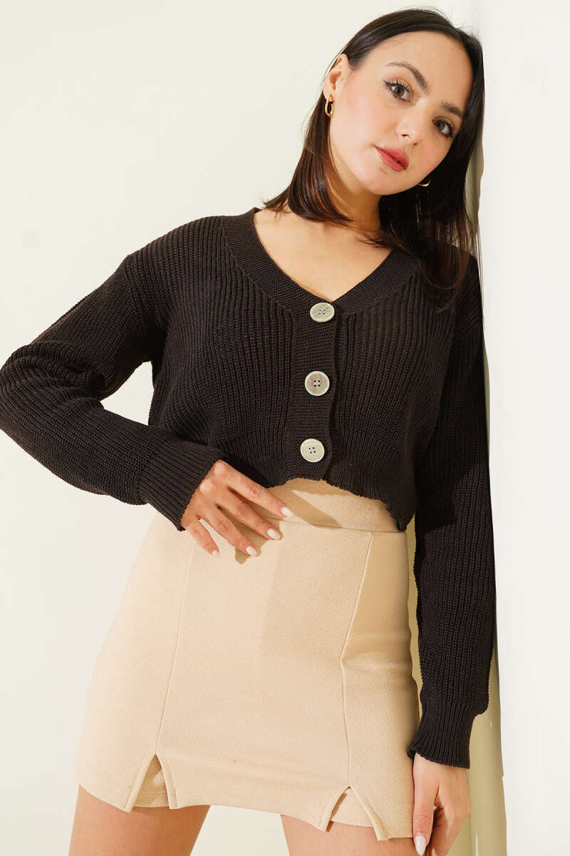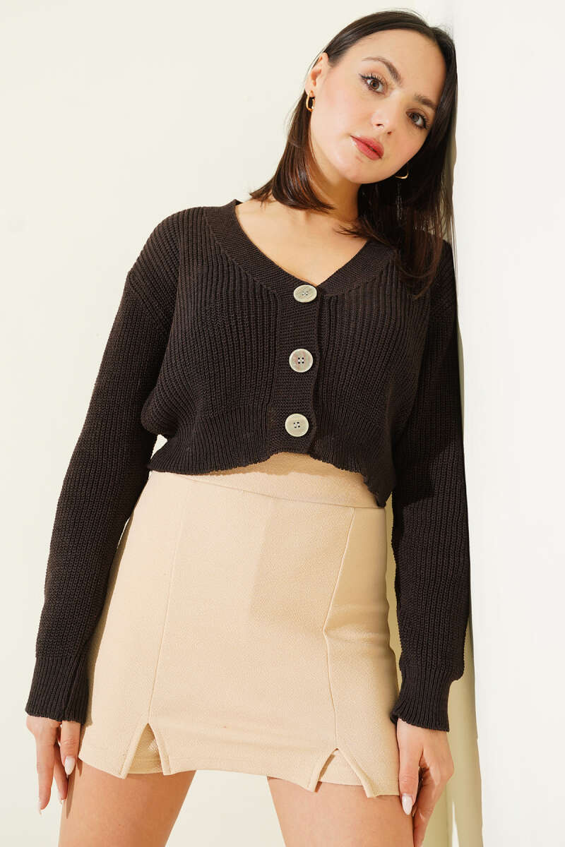 Üç Düğmeli Triko Crop Hırka Zümrüt