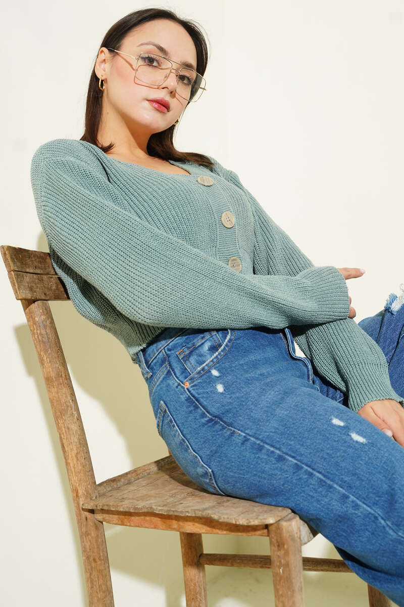 Üç Düğmeli Triko Crop Hırka Zümrüt