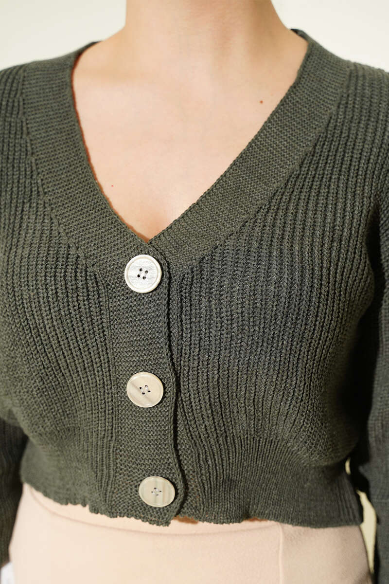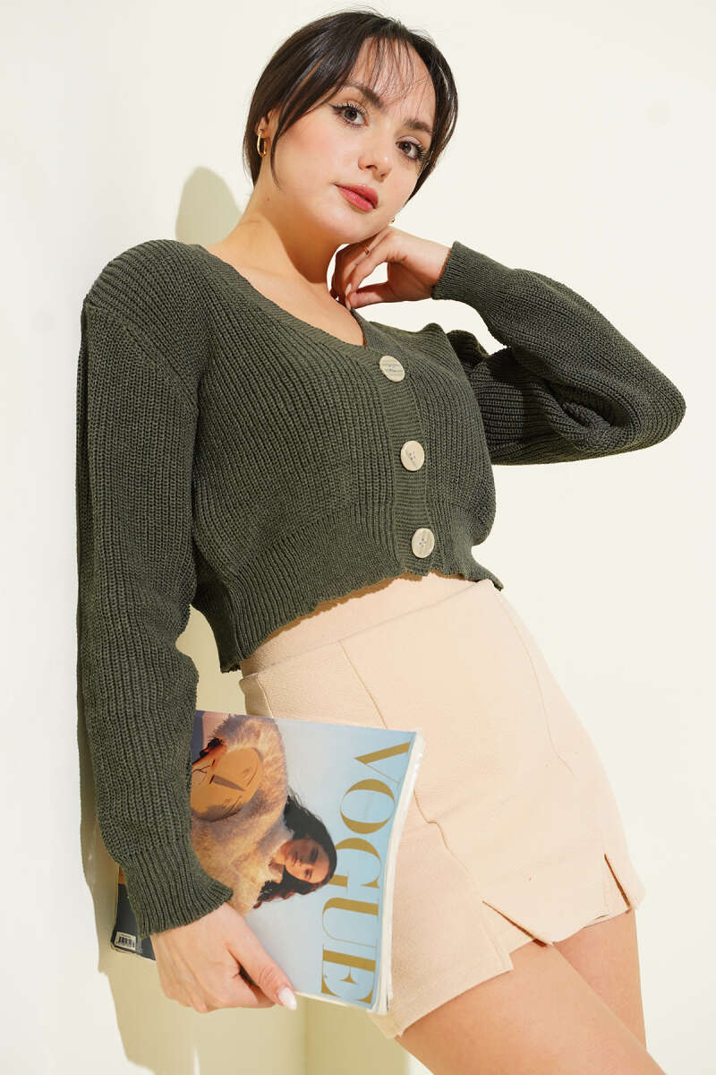 Üç Düğmeli Triko Crop Hırka Zümrüt