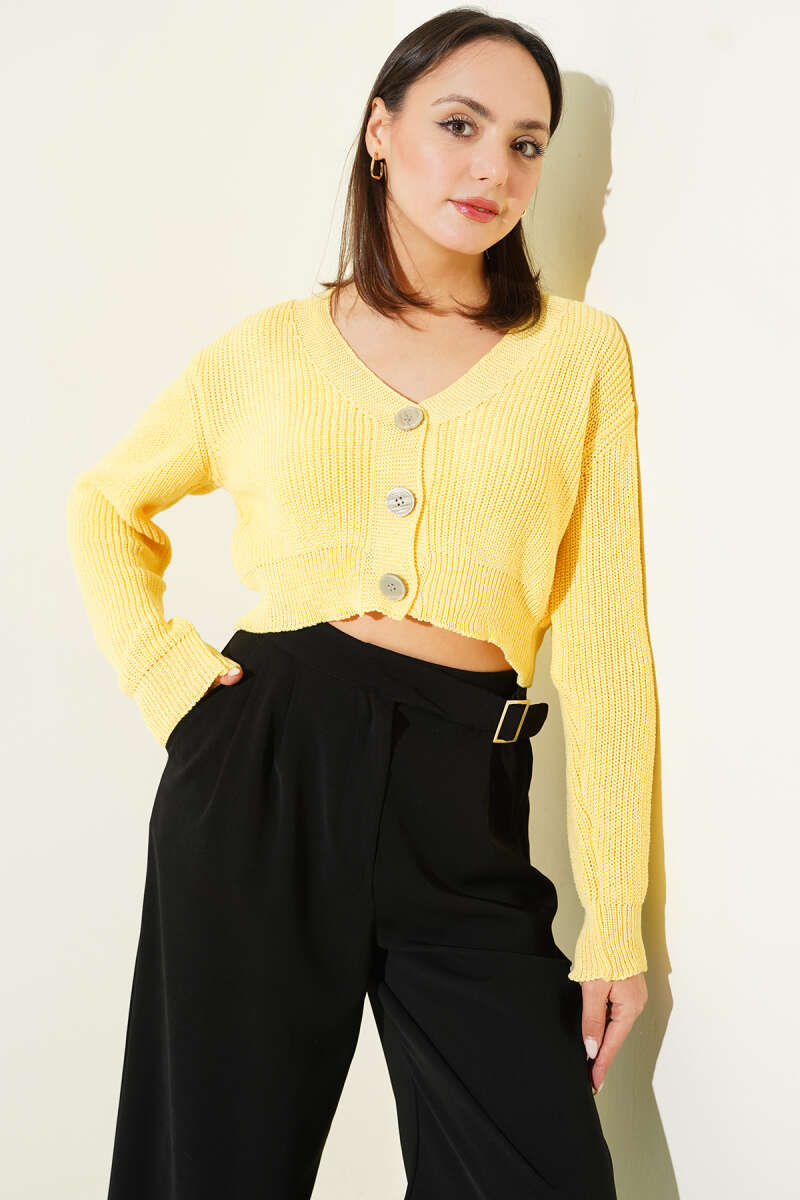 Üç Düğmeli Triko Crop Hırka Zümrüt