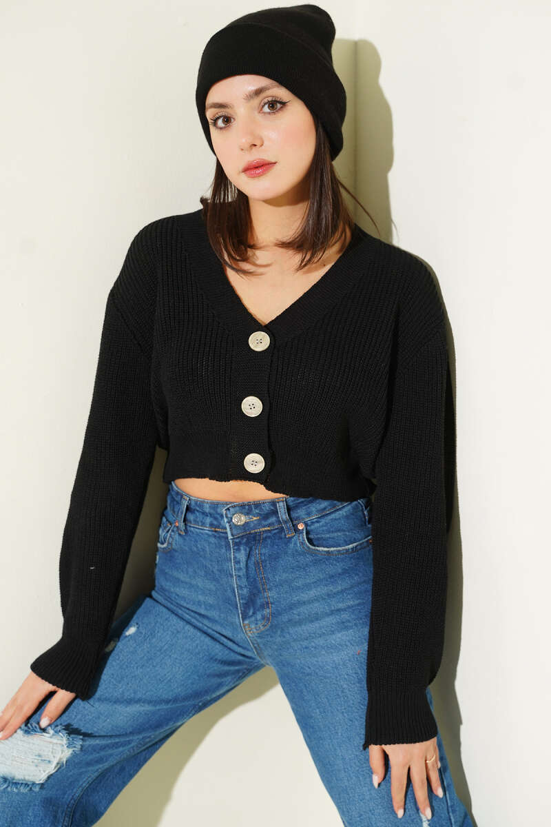 Üç Düğmeli Triko Crop Hırka Zümrüt