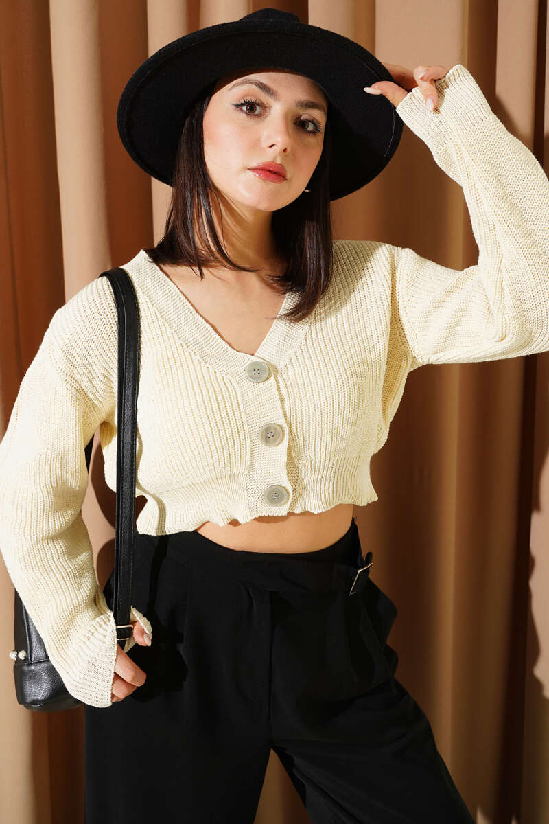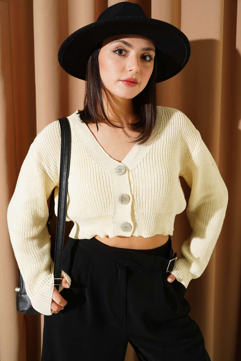 Üç Düğmeli Triko Crop Hırka Sarı