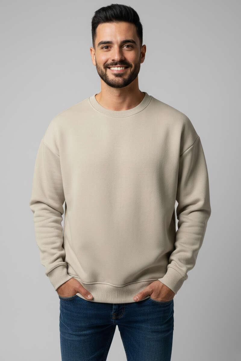 Üç İplik Bisiklet Yaka Erkek Sweatshirt Ekru
