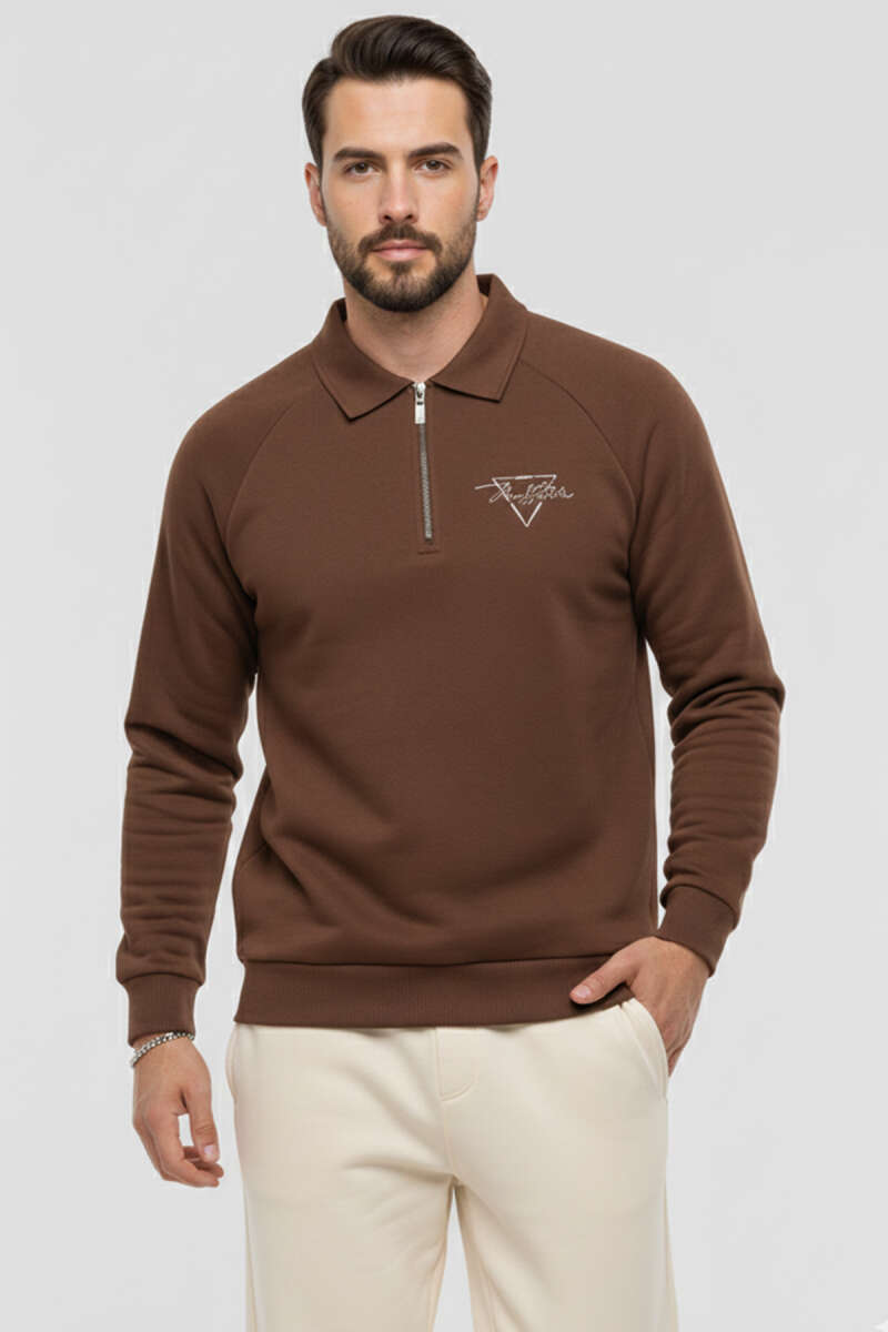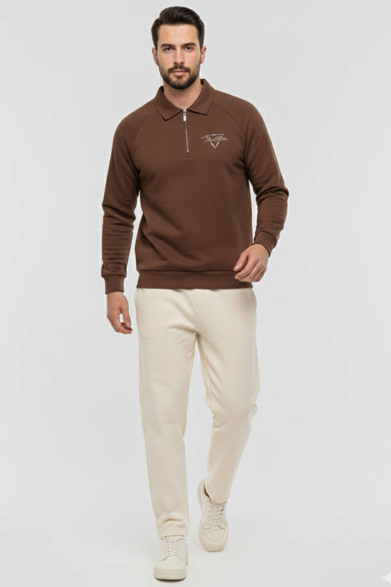 Desenli Polo Yaka Örme Erkek Sweatshirt Camel